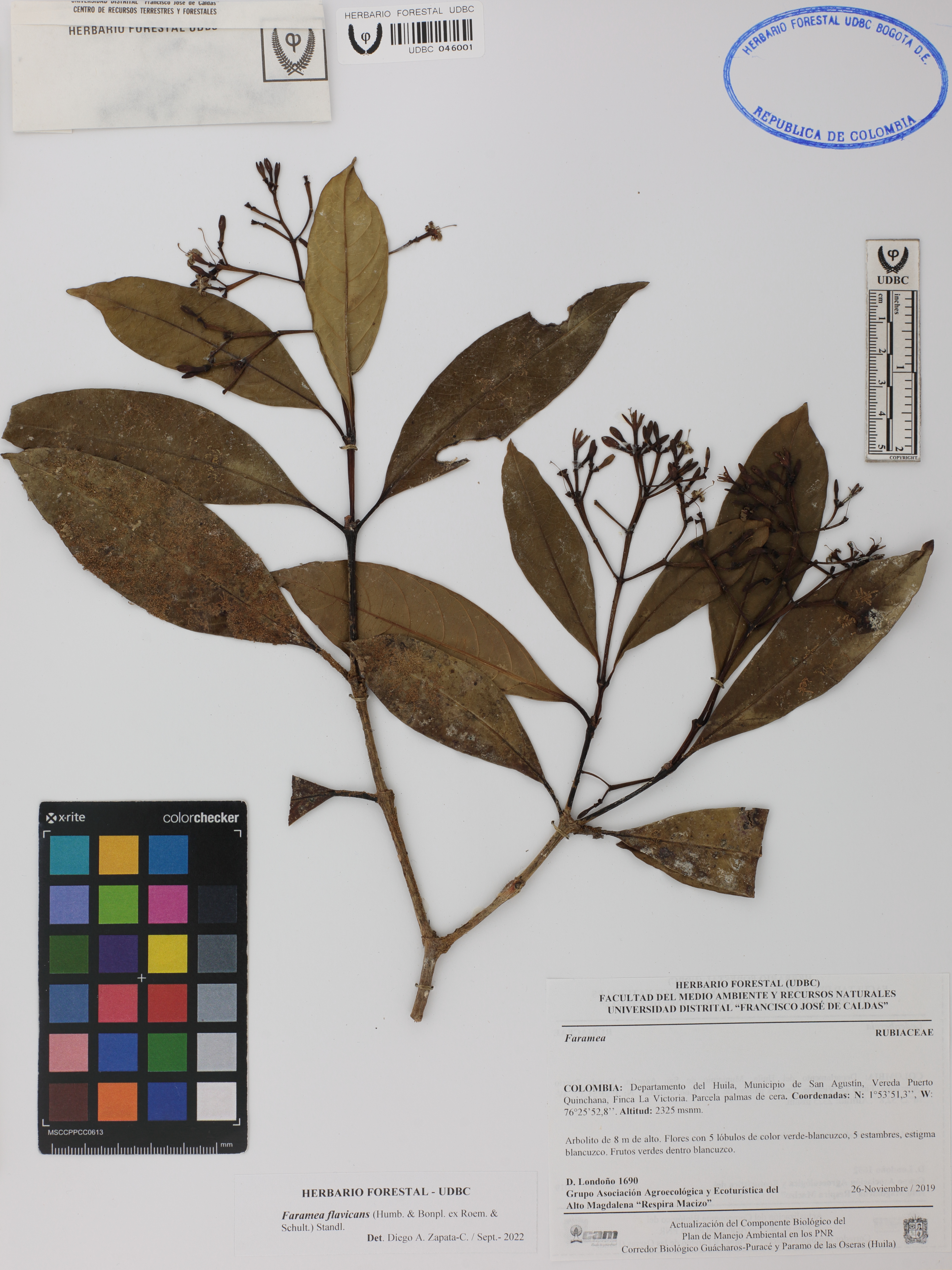 Fotografía del ejemplar Londoño, D. 1690, determinado como Faramea flavicans en el año 2022