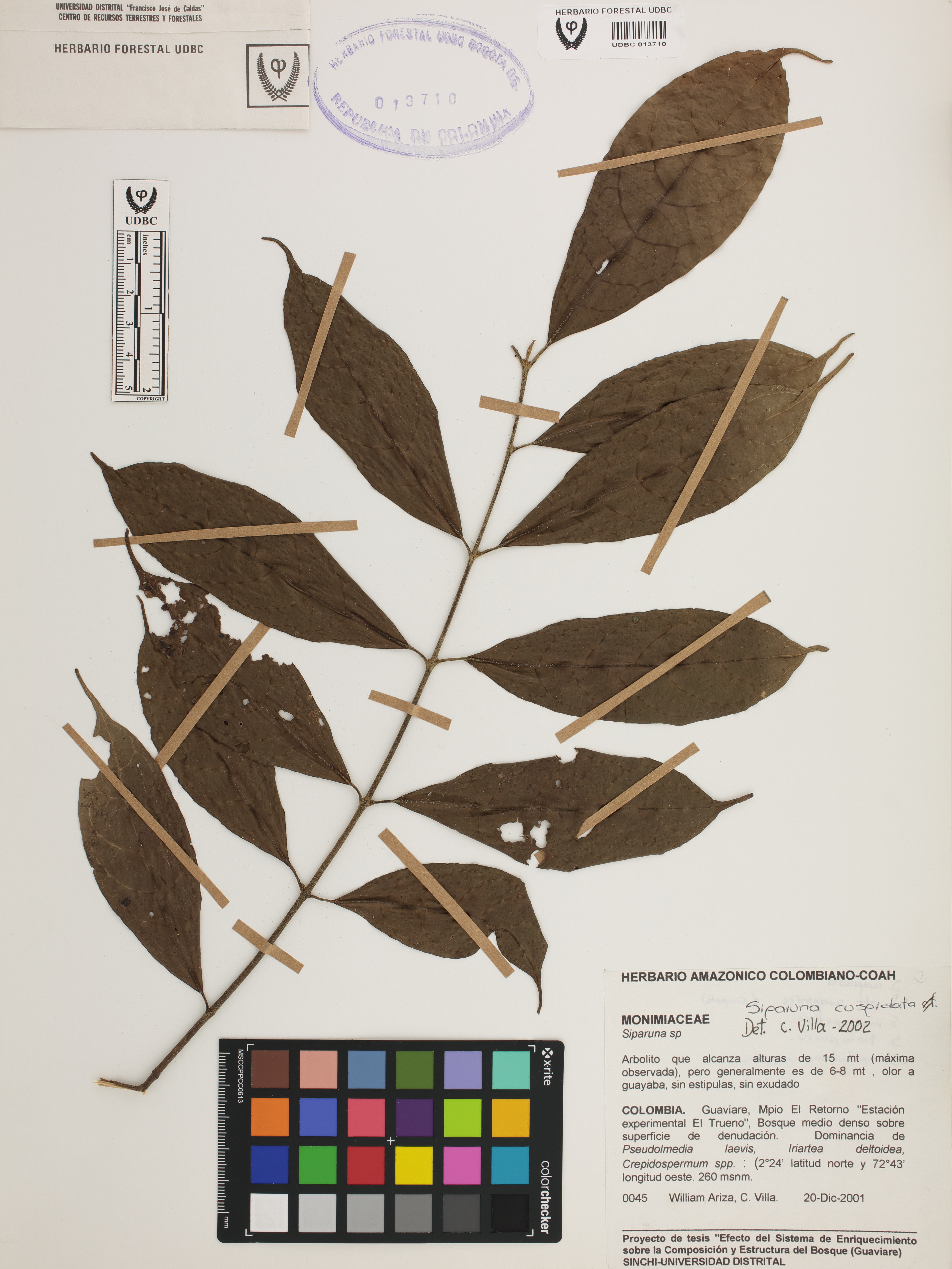 Fotografía del ejemplar Ariza, W. 45, determinado como Siparuna cuspidata en el año 2002