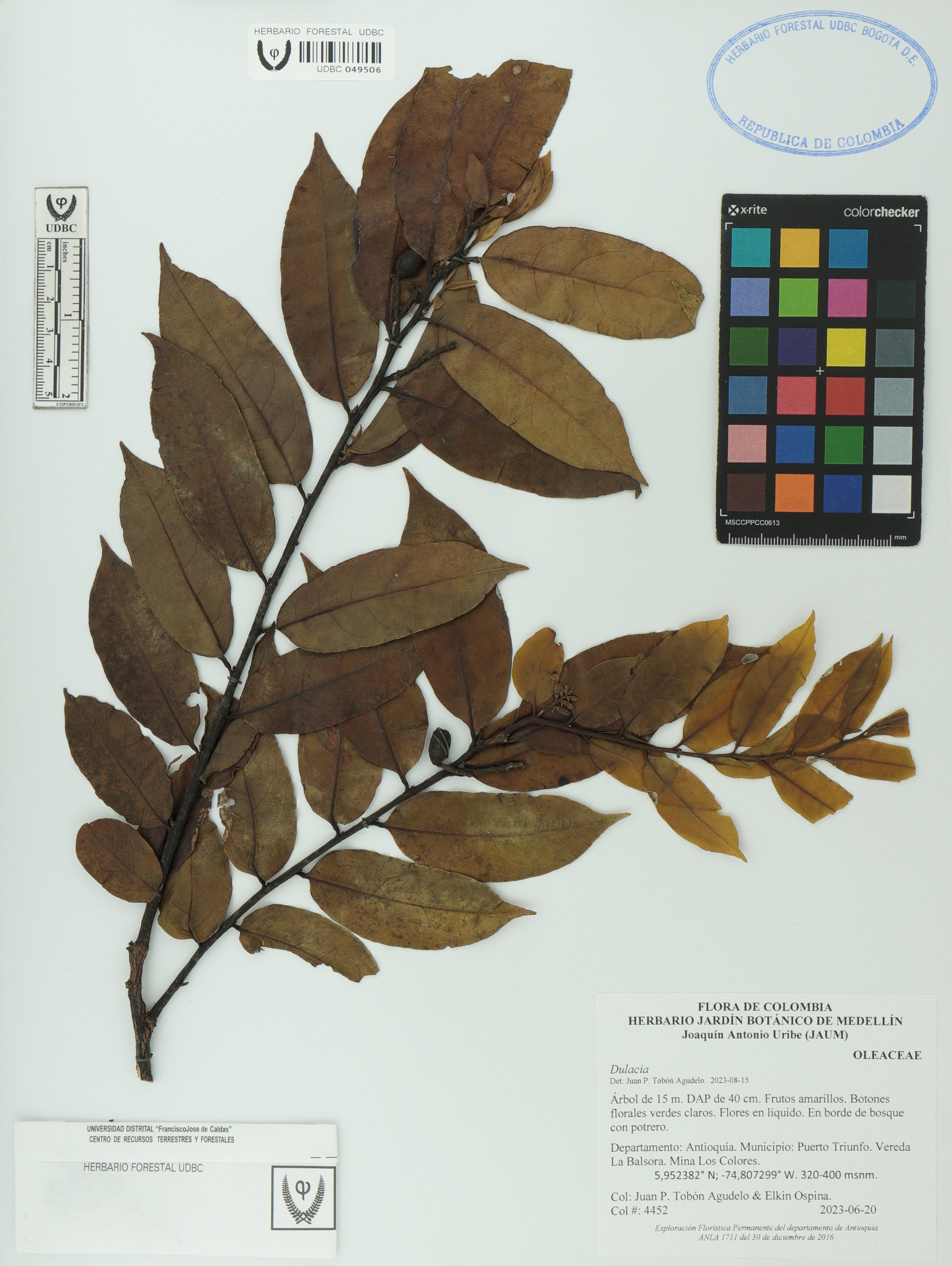 Fotografía del ejemplar Tobón-A., J. 4452, determinado como Dulacia sp. en el año 2023
