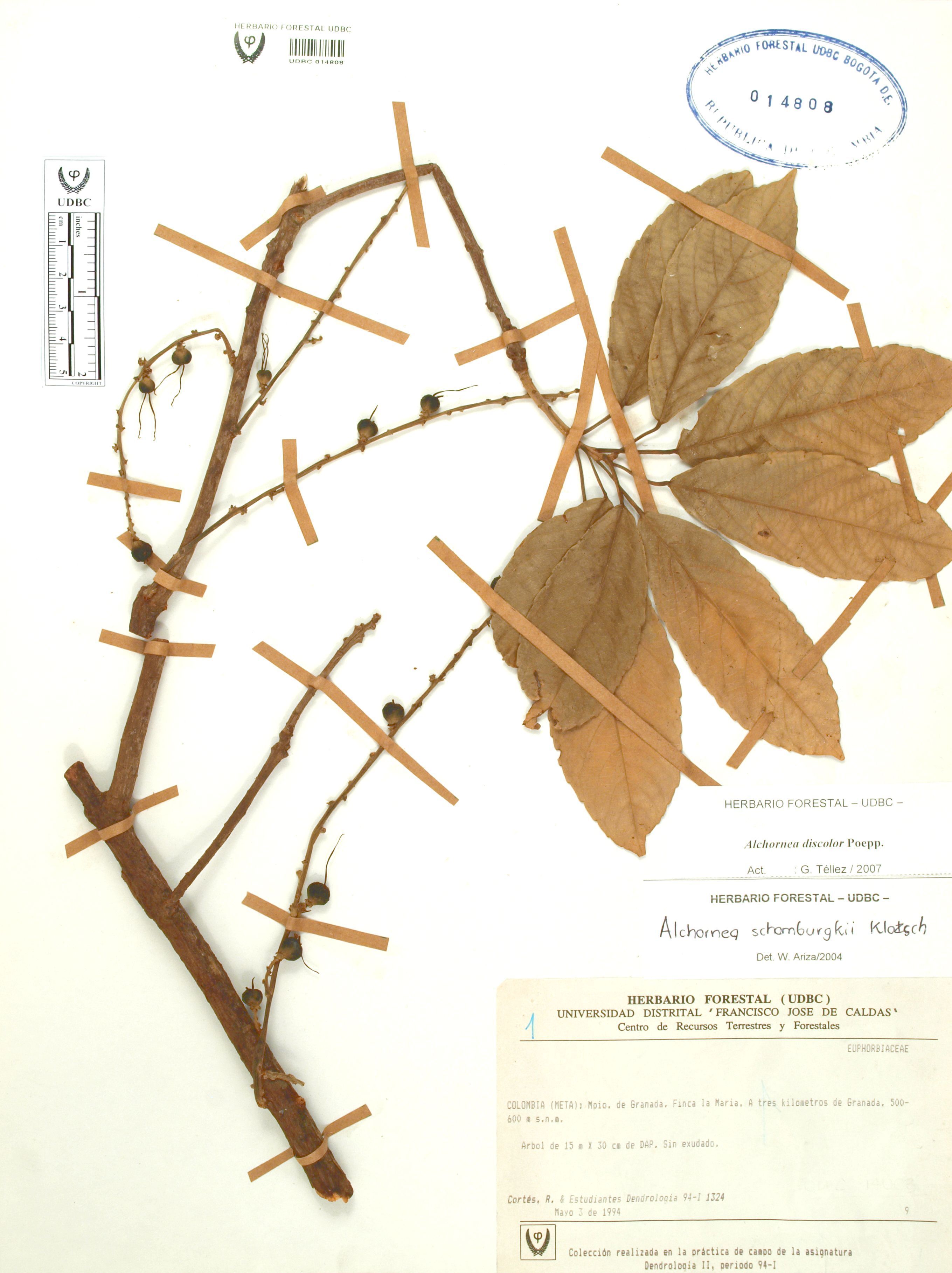 Fotografía del ejemplar Cortés-B., R. 1324, determinado como Alchornea discolor en el año 2007