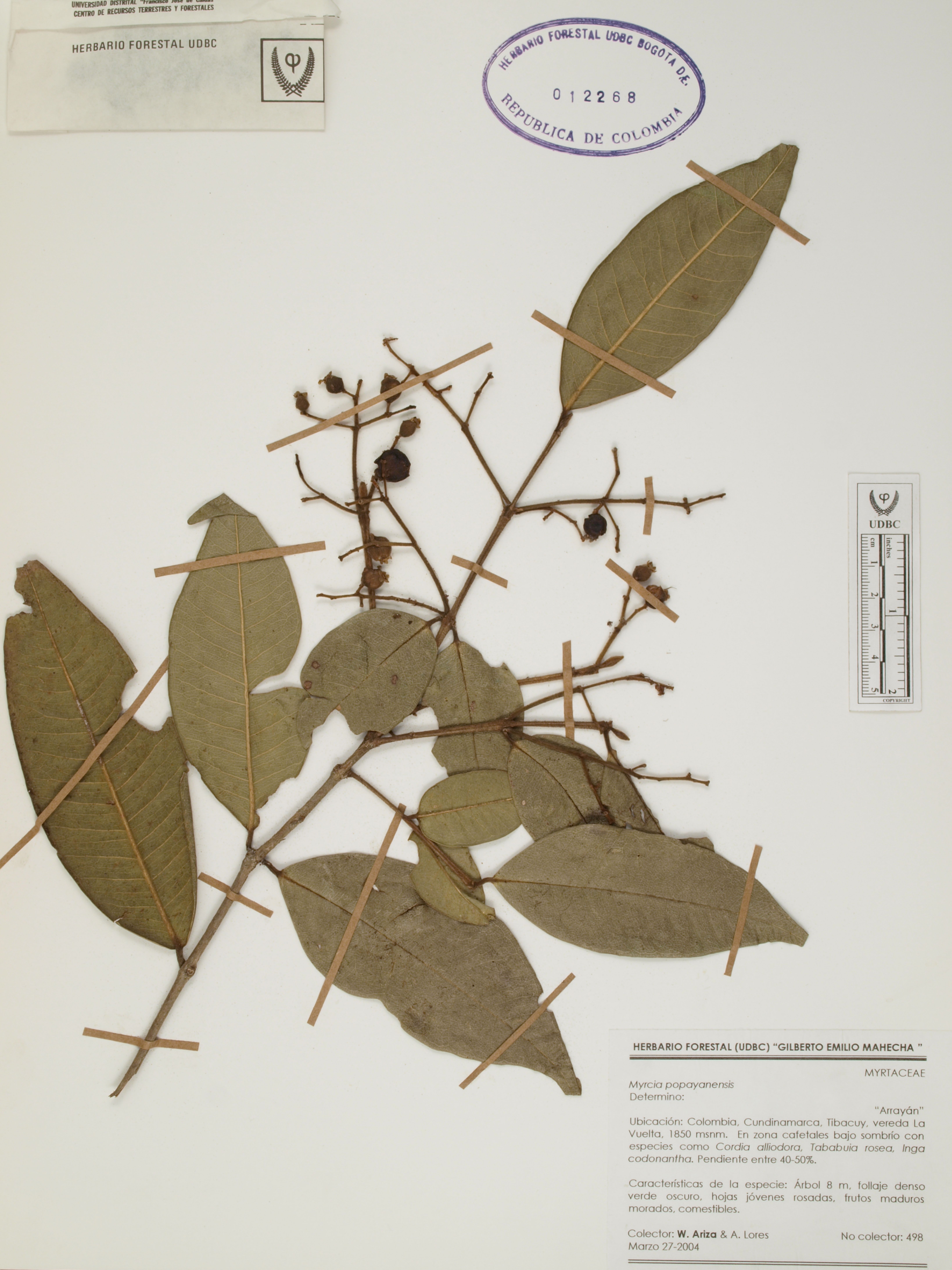 Fotografía del ejemplar Ariza, W. 498, determinado como Myrcia popayanensis