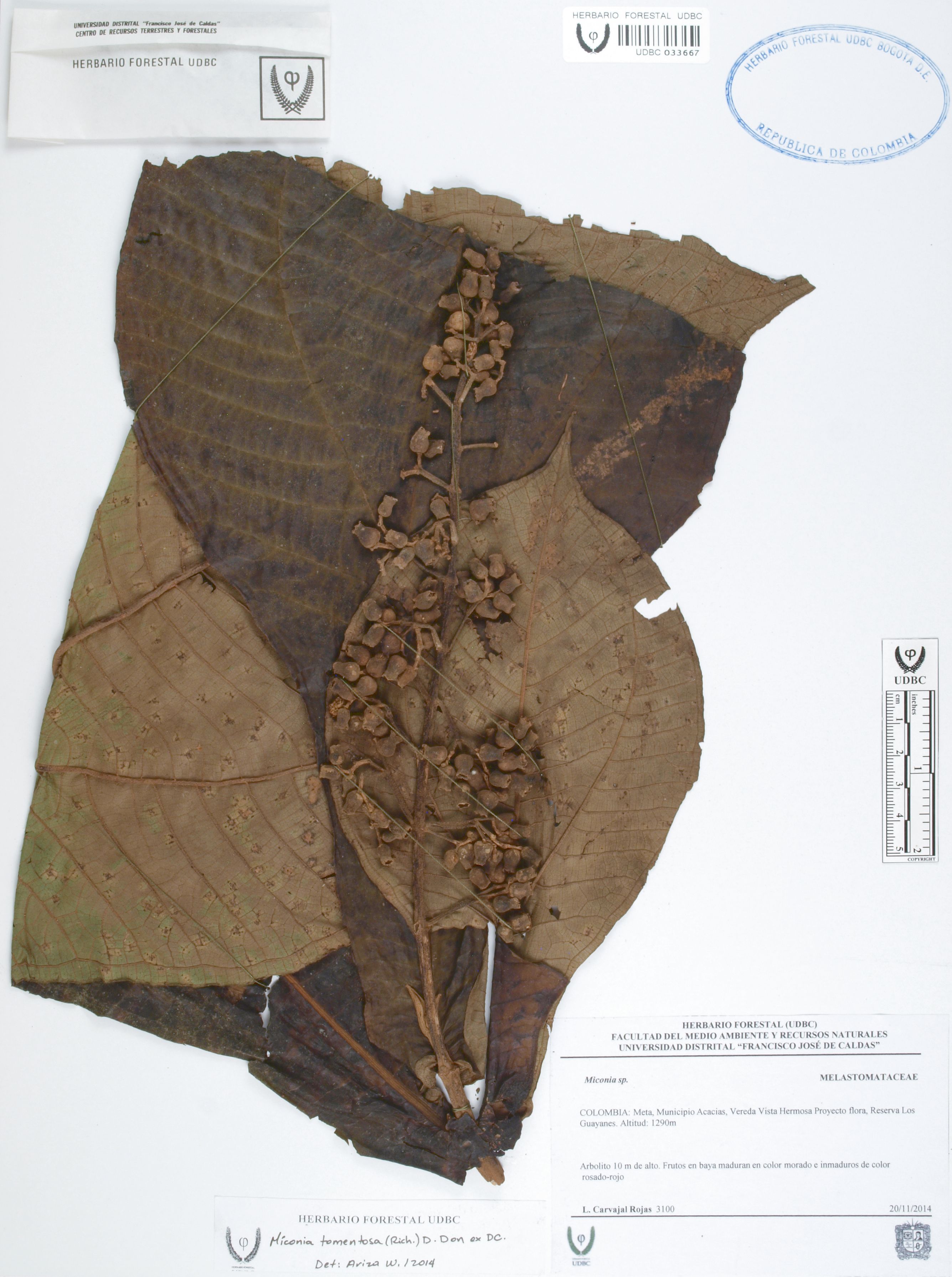 Fotografía del ejemplar Carvajal, L. 3100, determinado como Miconia tomentosa en el año 2014