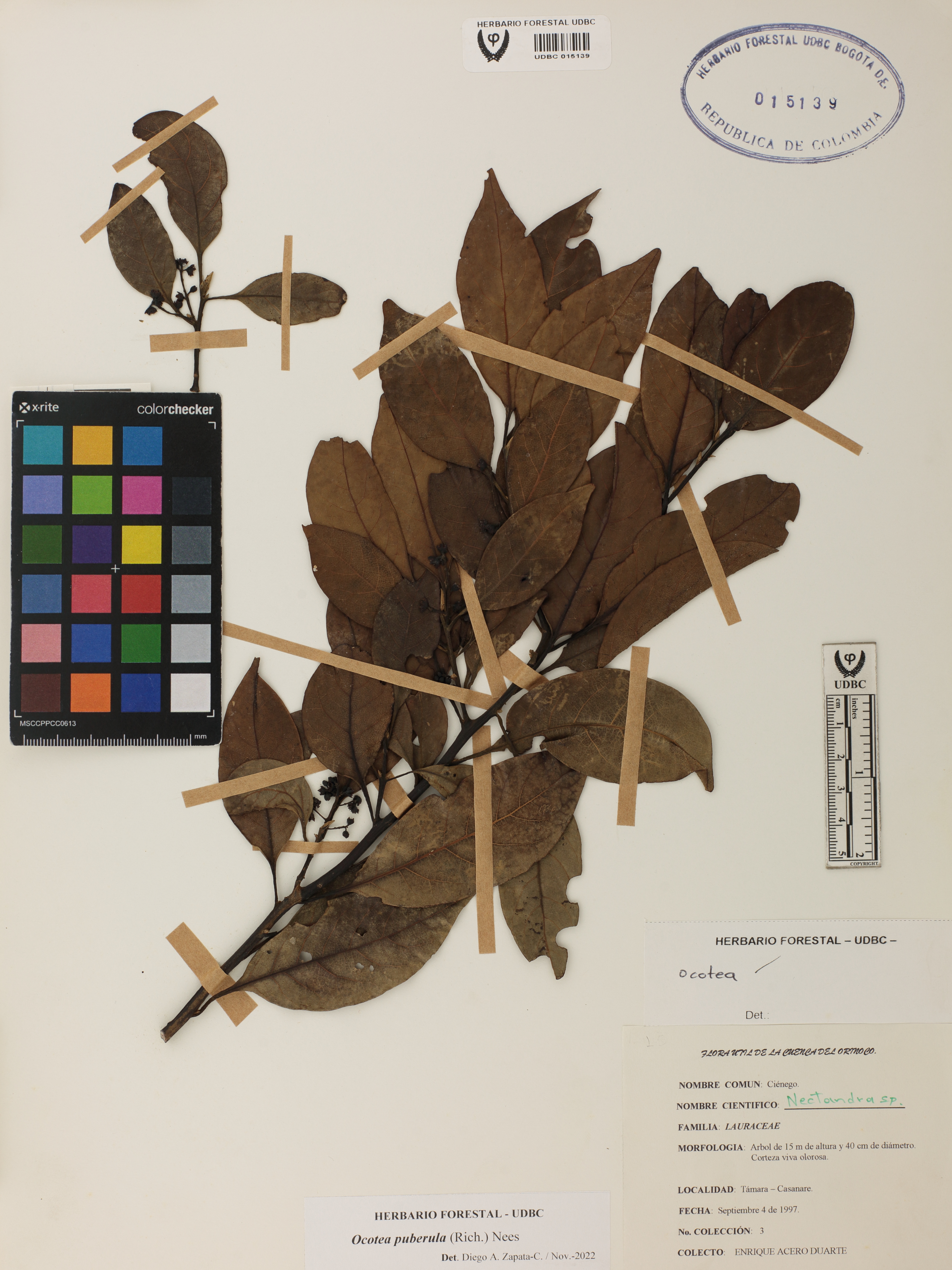 Fotografía del ejemplar Acero, E. 3, determinado como Ocotea puberula en el año 2022