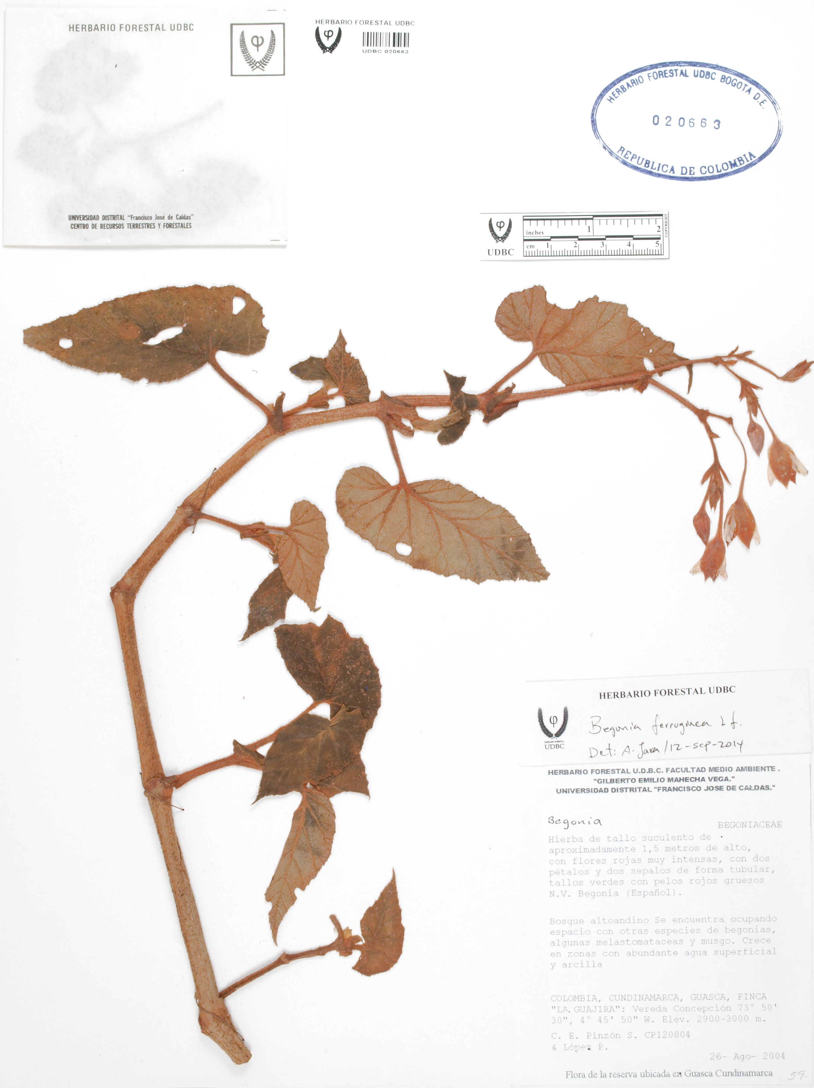 Fotografía del ejemplar Pinzón, C. 12, determinado como Begonia ferruginea en el año 2014