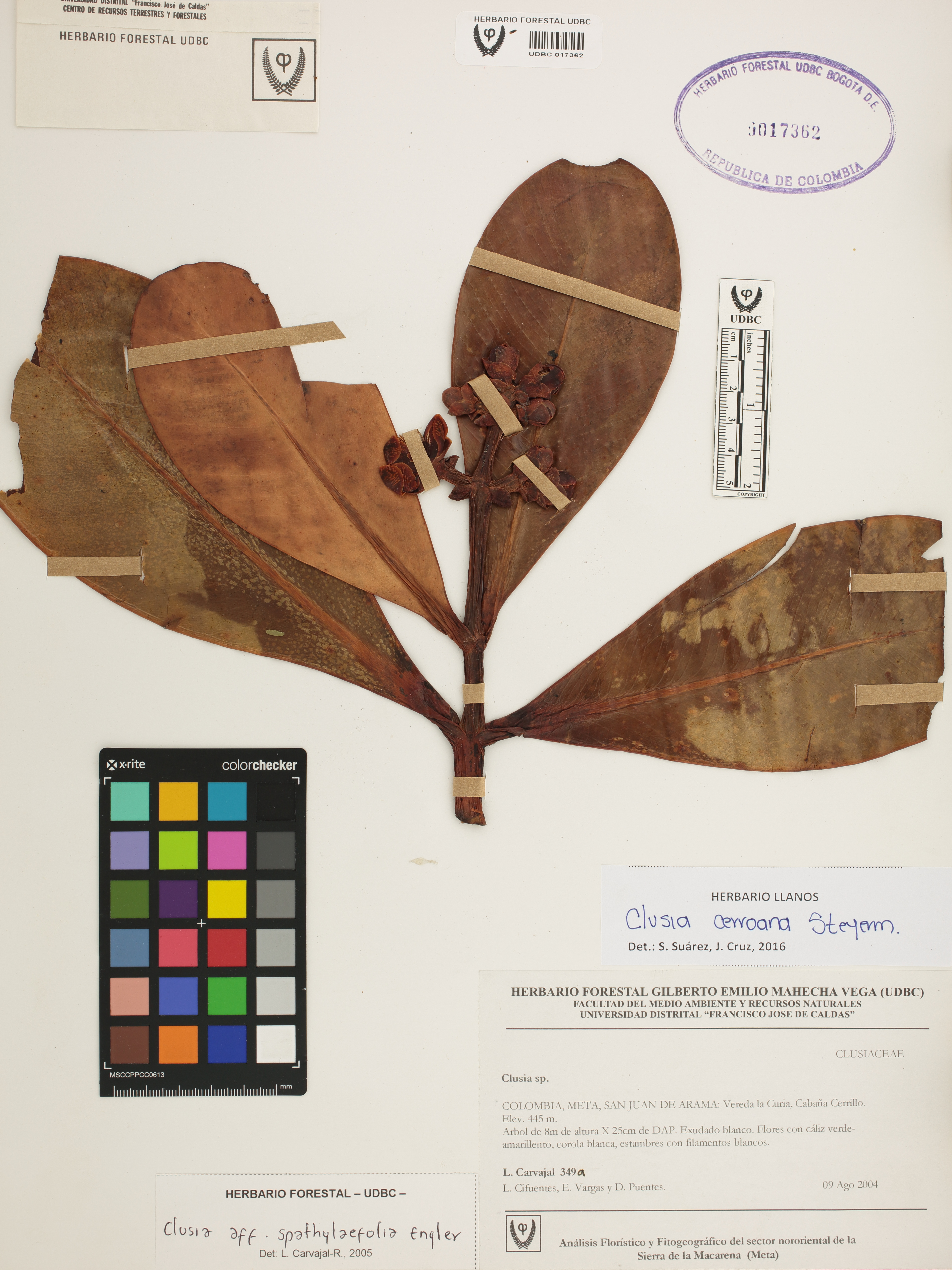 Fotografía del ejemplar Carvajal, L. 349, determinado como Clusia cerroana en el año 2016