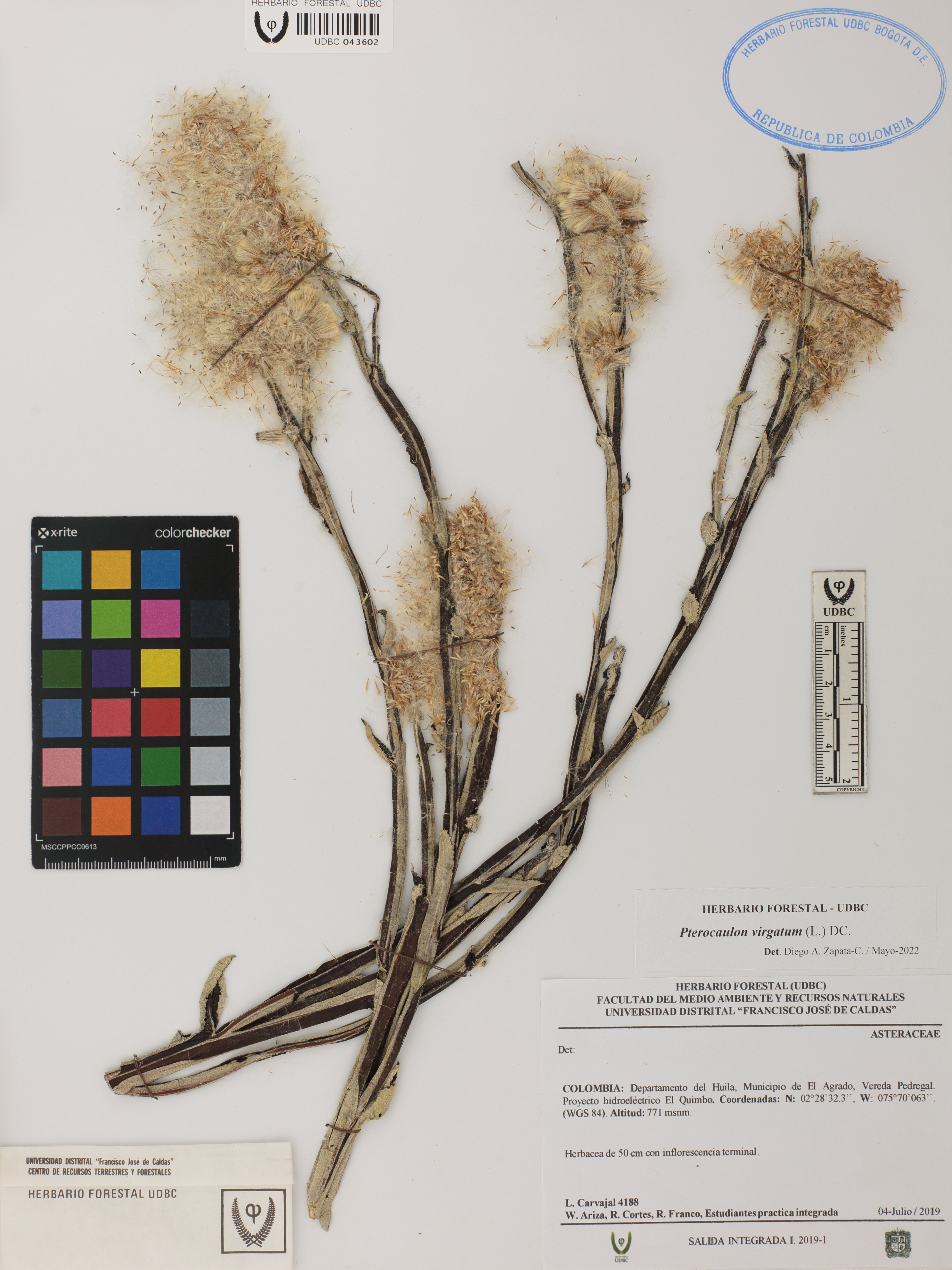 Fotografía del ejemplar Carvajal, L. 4188, determinado como Pterocaulon virgatum en el año 2022