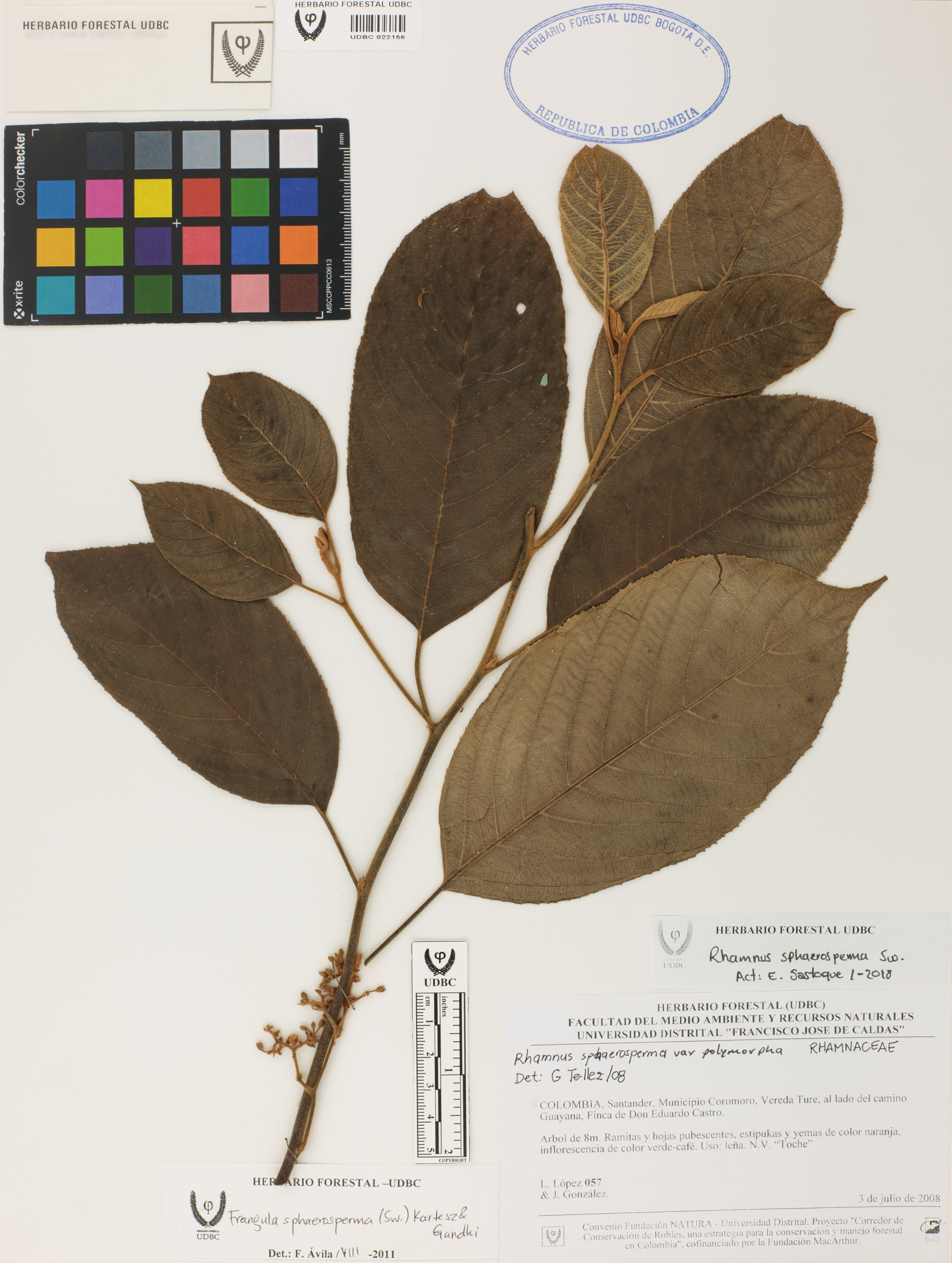 Fotografía del ejemplar López, L. 57, determinado como Frangula sphaerosperma en el año 2011