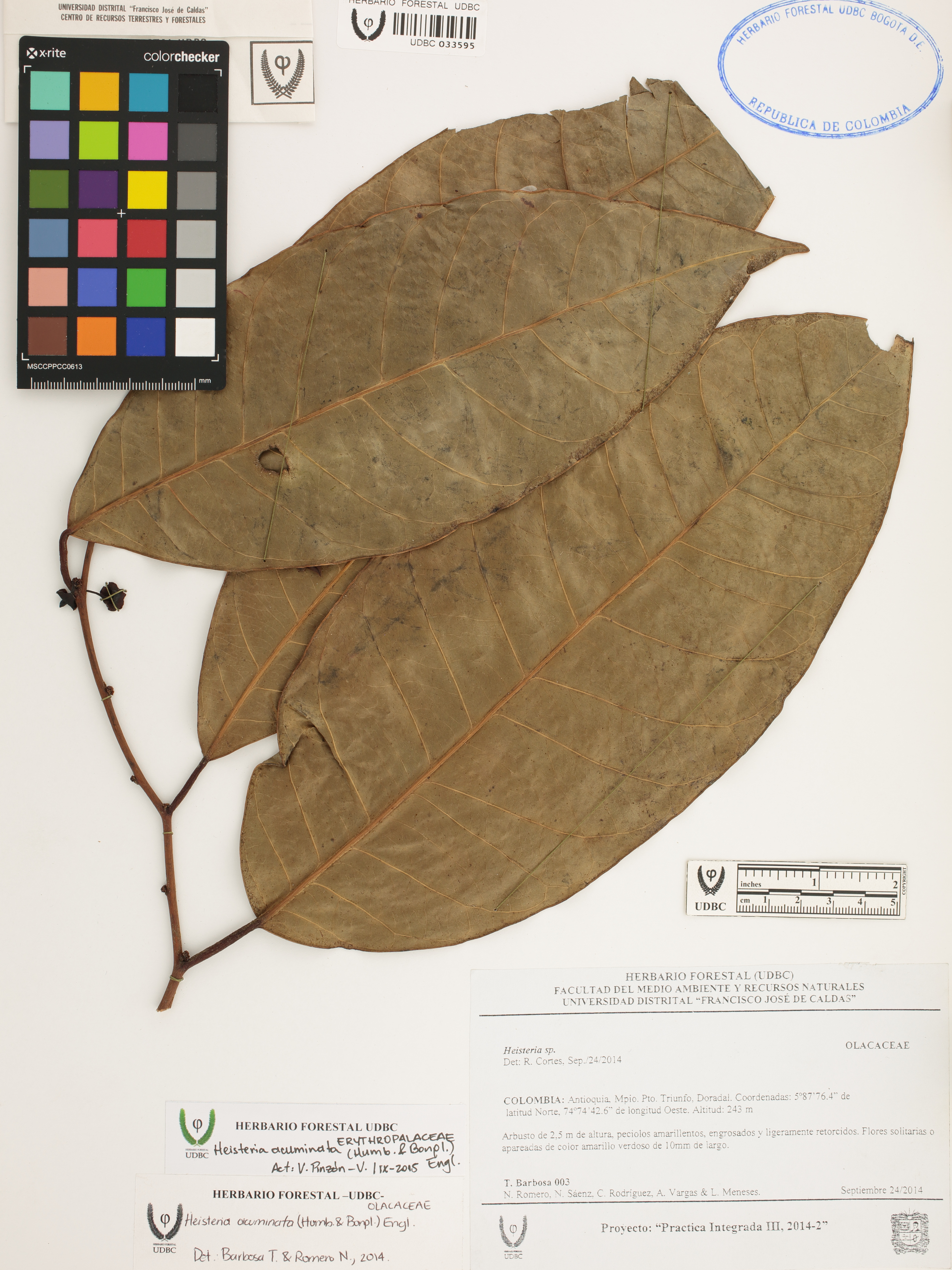 Fotografía del ejemplar Barbosa, T. 3, determinado como Heisteria acuminata en el año 2014