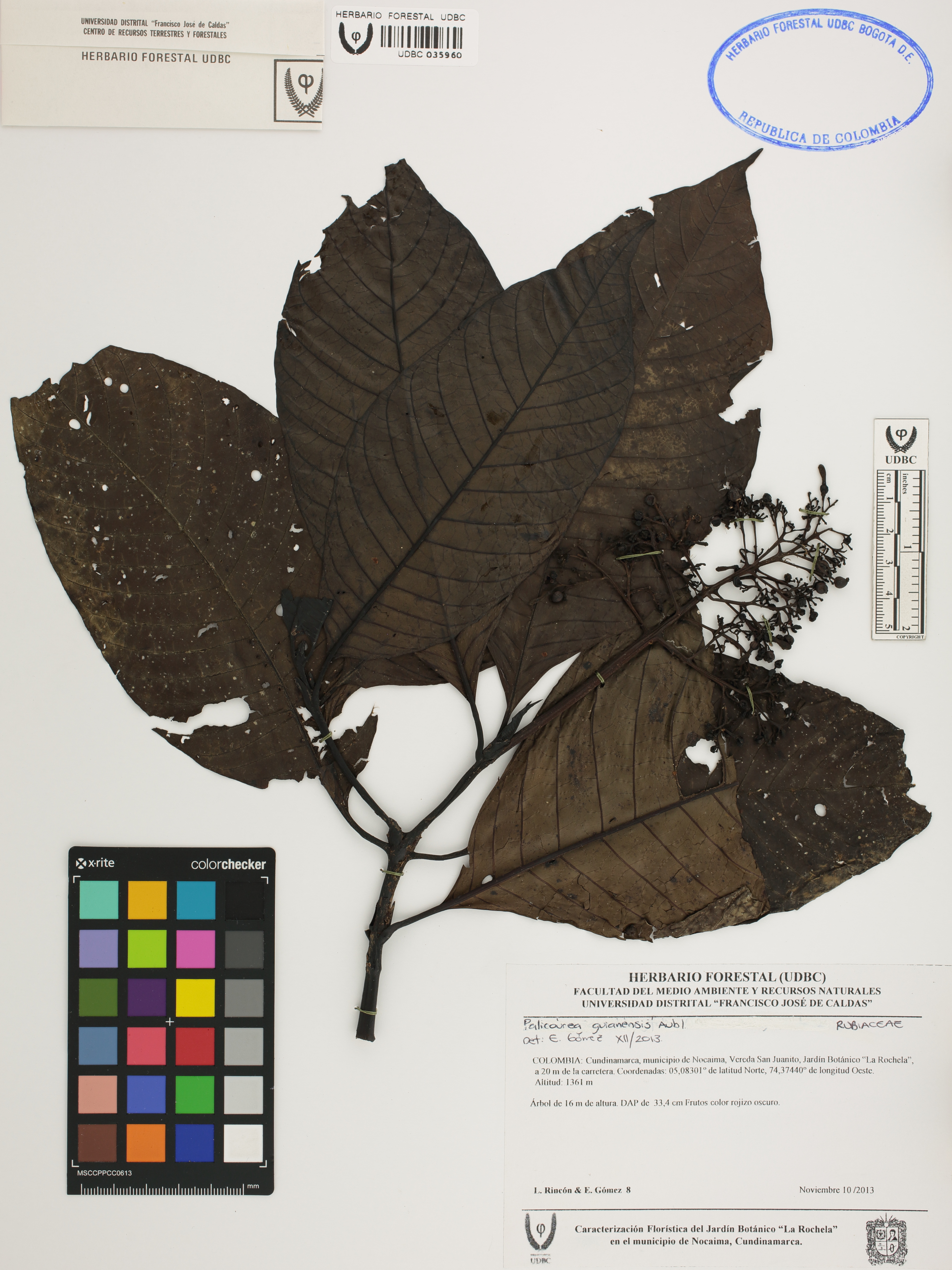 Fotografía del ejemplar Rincón, L. 8, determinado como Palicourea guianensis en el año 2013