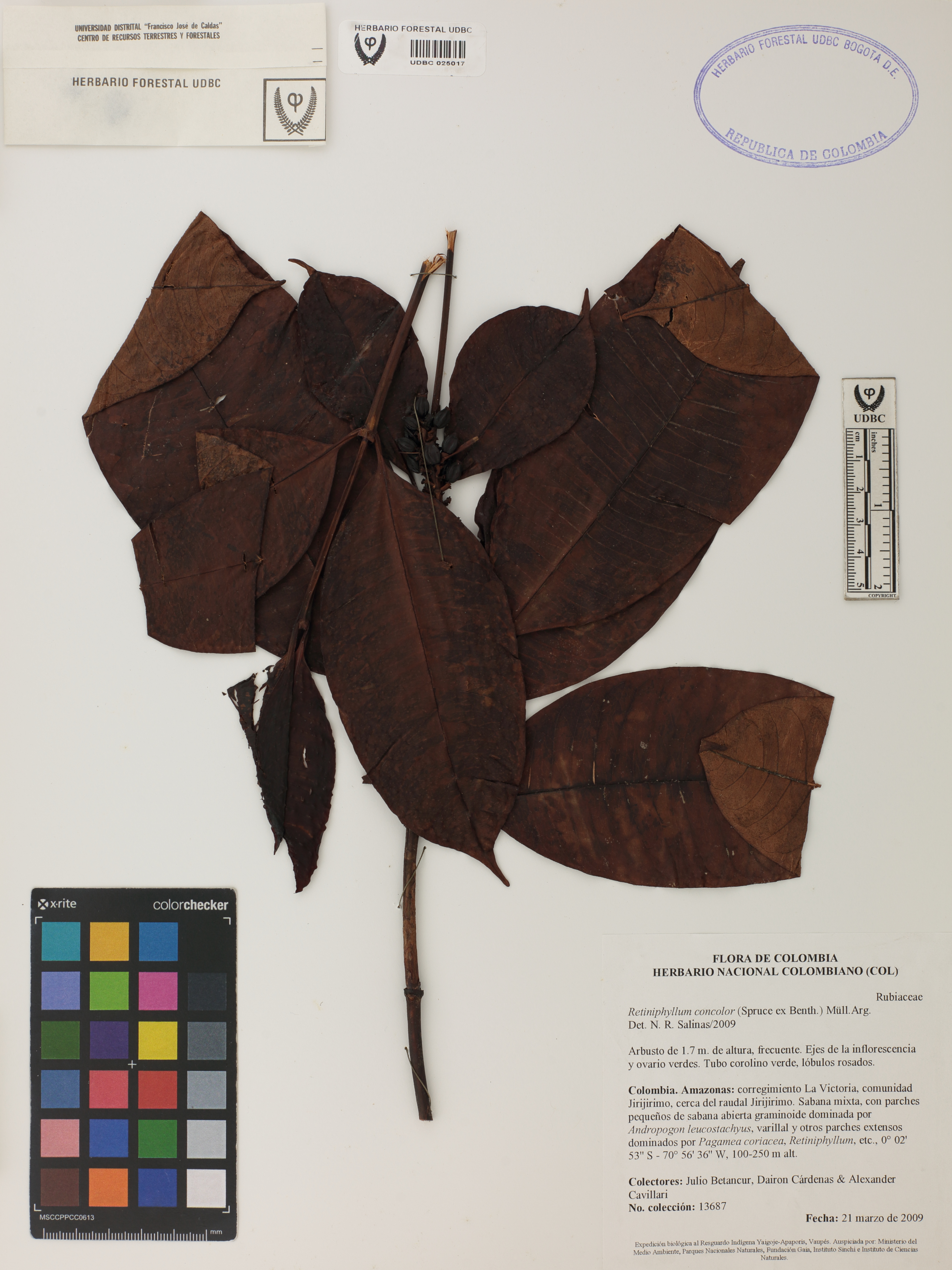 Fotografía del ejemplar Betancur, J. 13687, determinado como Retiniphyllum concolor en el año 2009