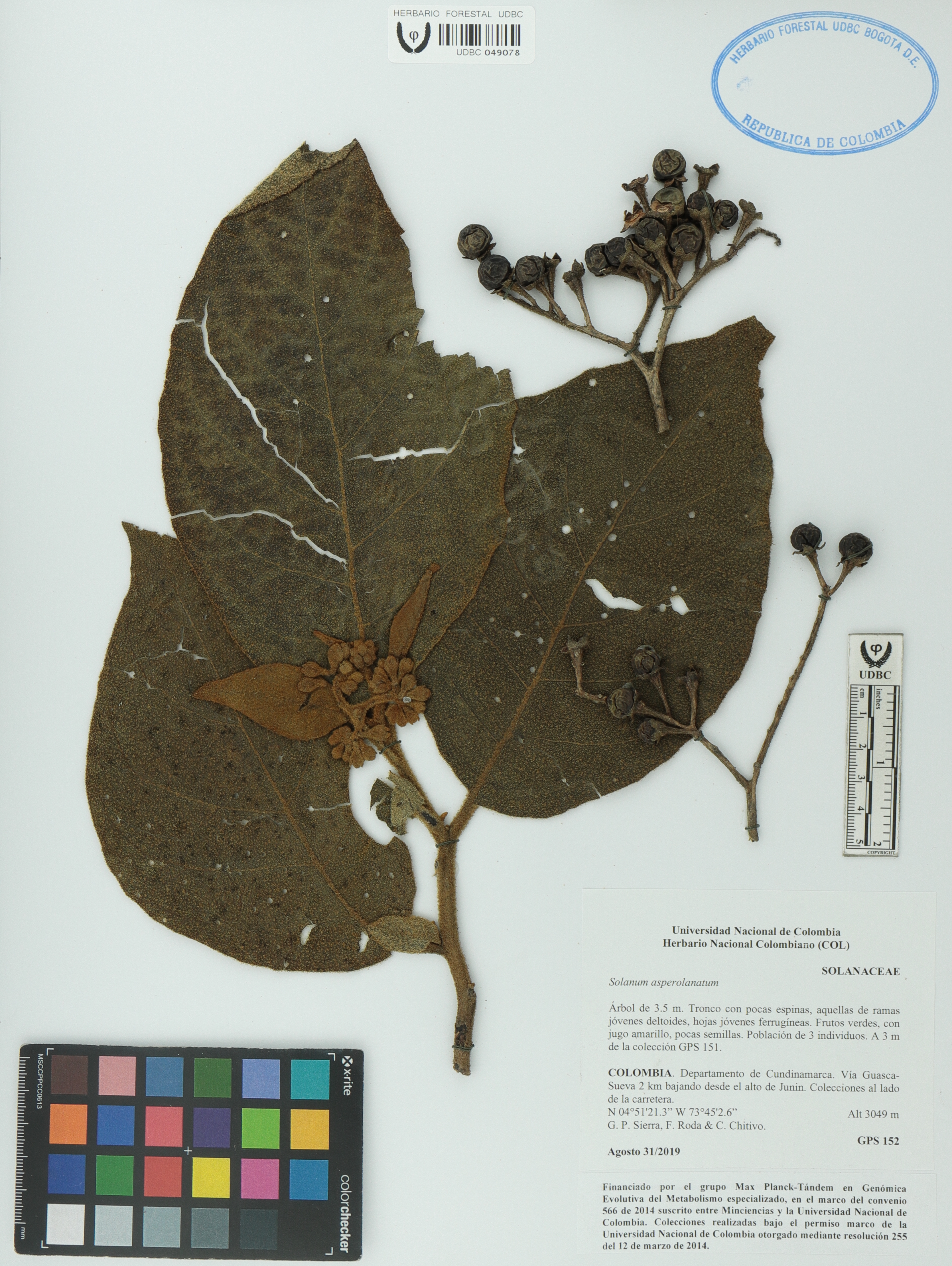 Fotografía del ejemplar Sierra, G. 152, determinado como Solanum asperolanatum