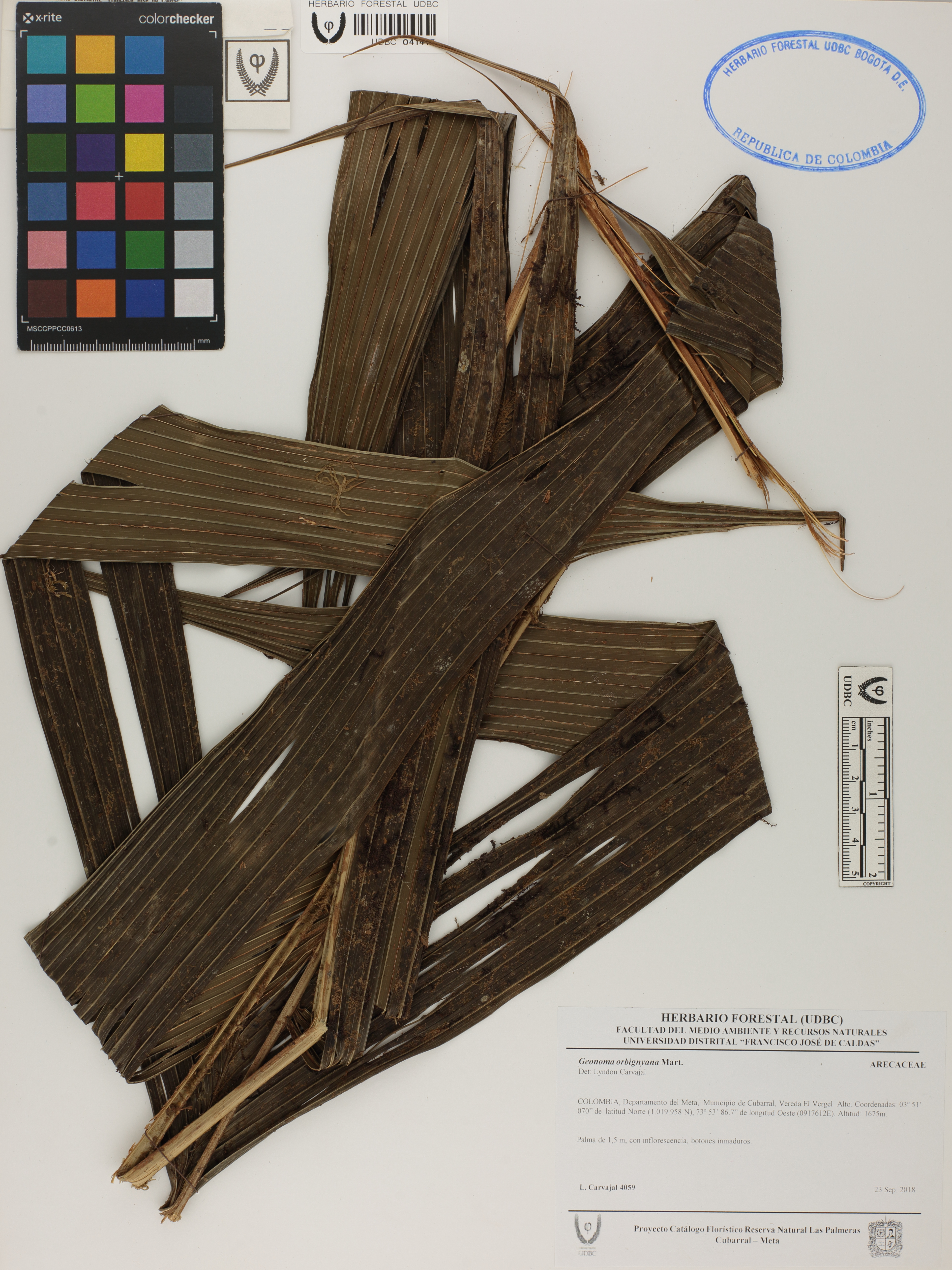 Fotografía del ejemplar Carvajal, L. 4059, determinado como Geonoma orbignyana