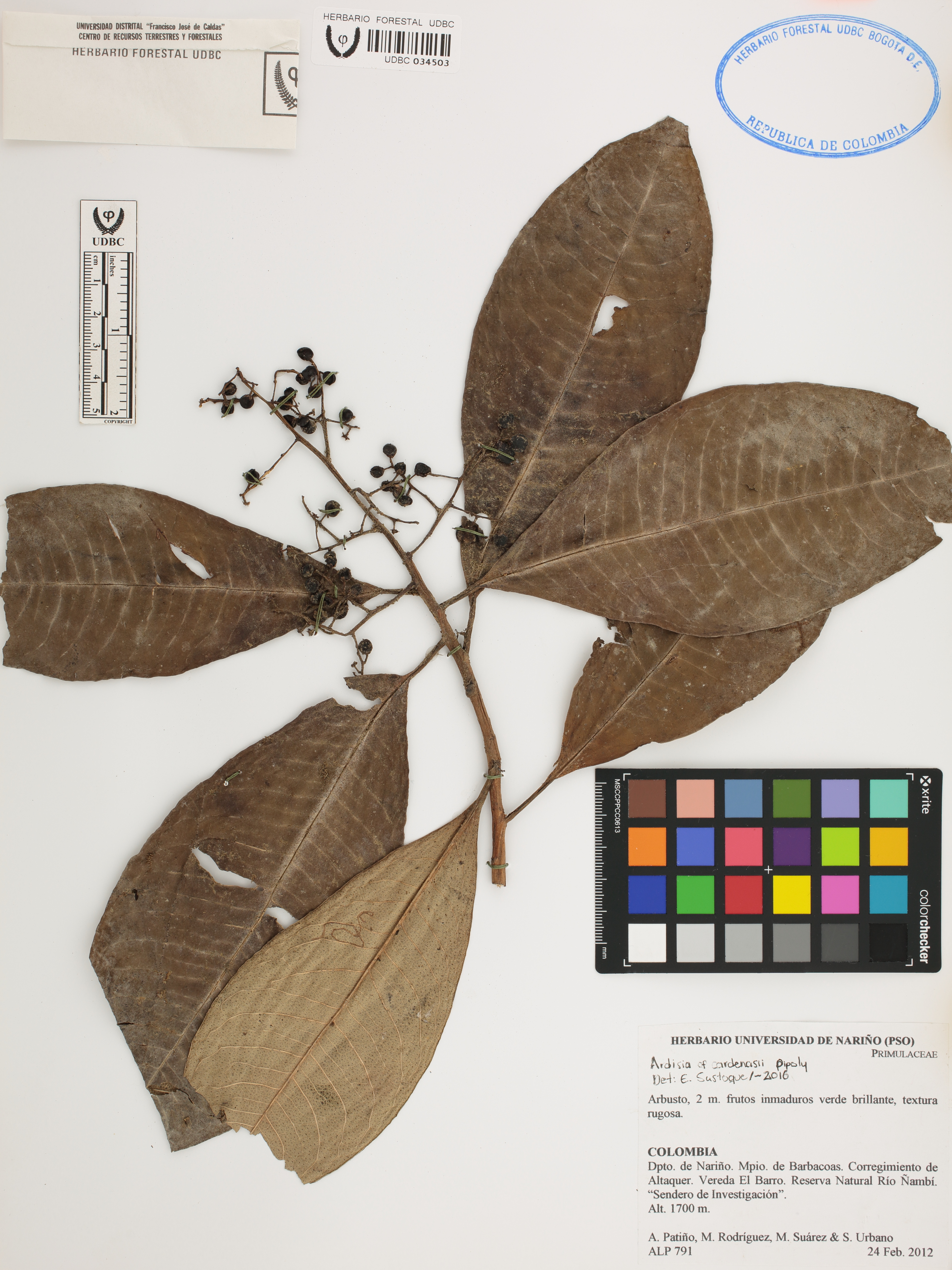 Fotografía del ejemplar Patiño, A. 791, determinado como Ardisia cardenasii en el año 2016