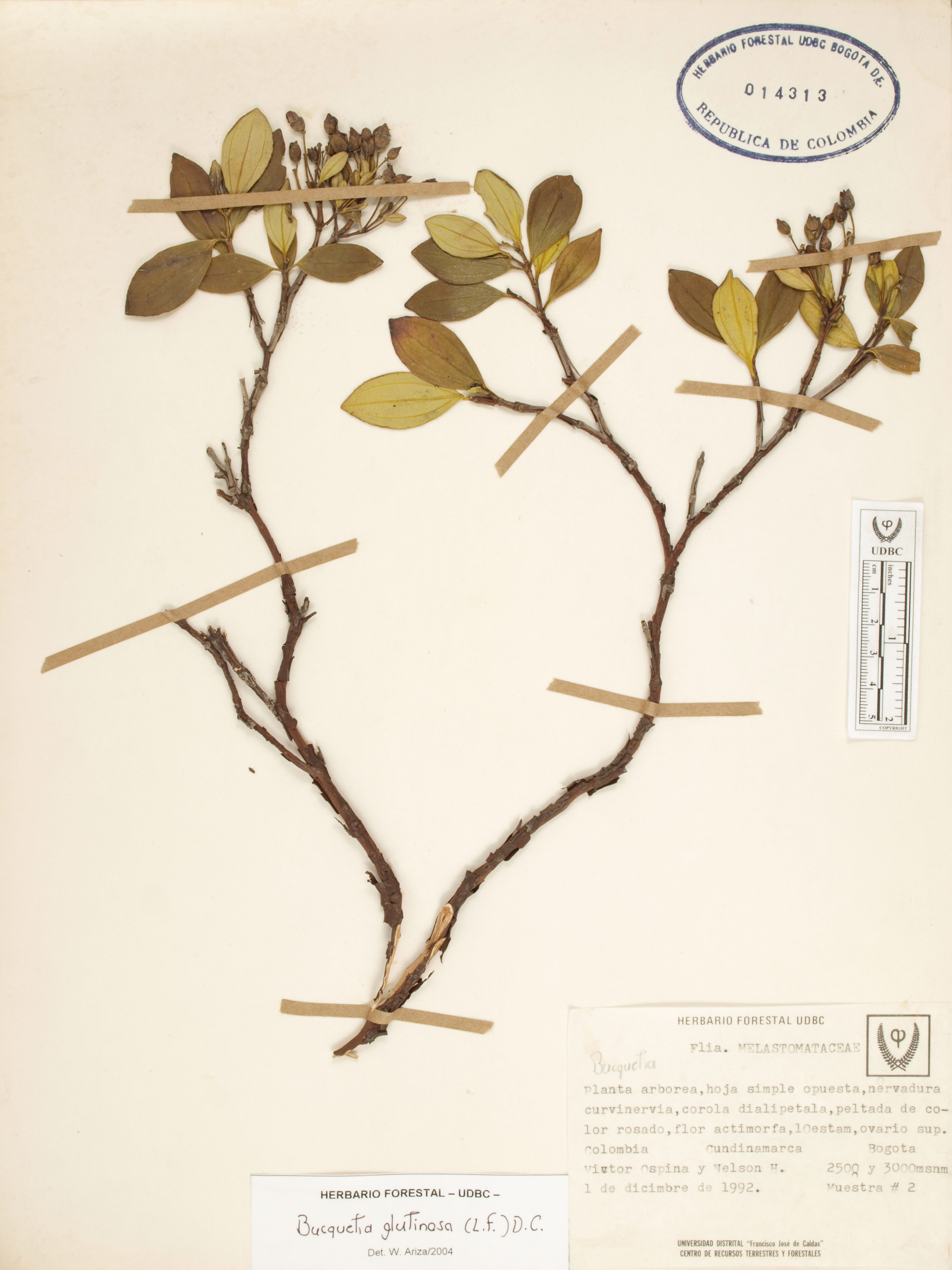 Fotografía del ejemplar Ospina, V. 2, determinado como Bucquetia glutinosa en el año 2004
