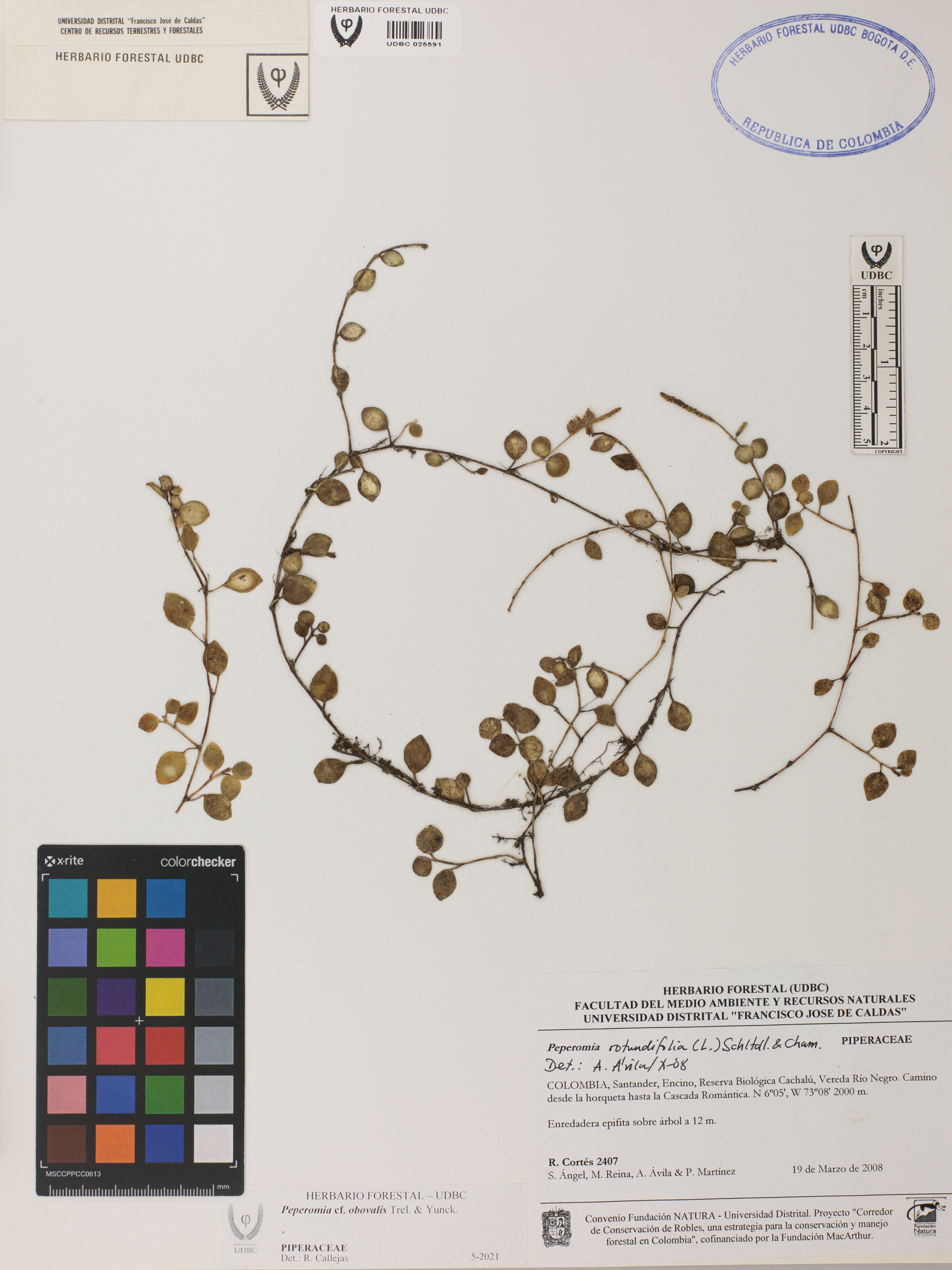 Fotografía del ejemplar Cortés, R. 2407, determinado como Peperomia obovalis en el año 2021