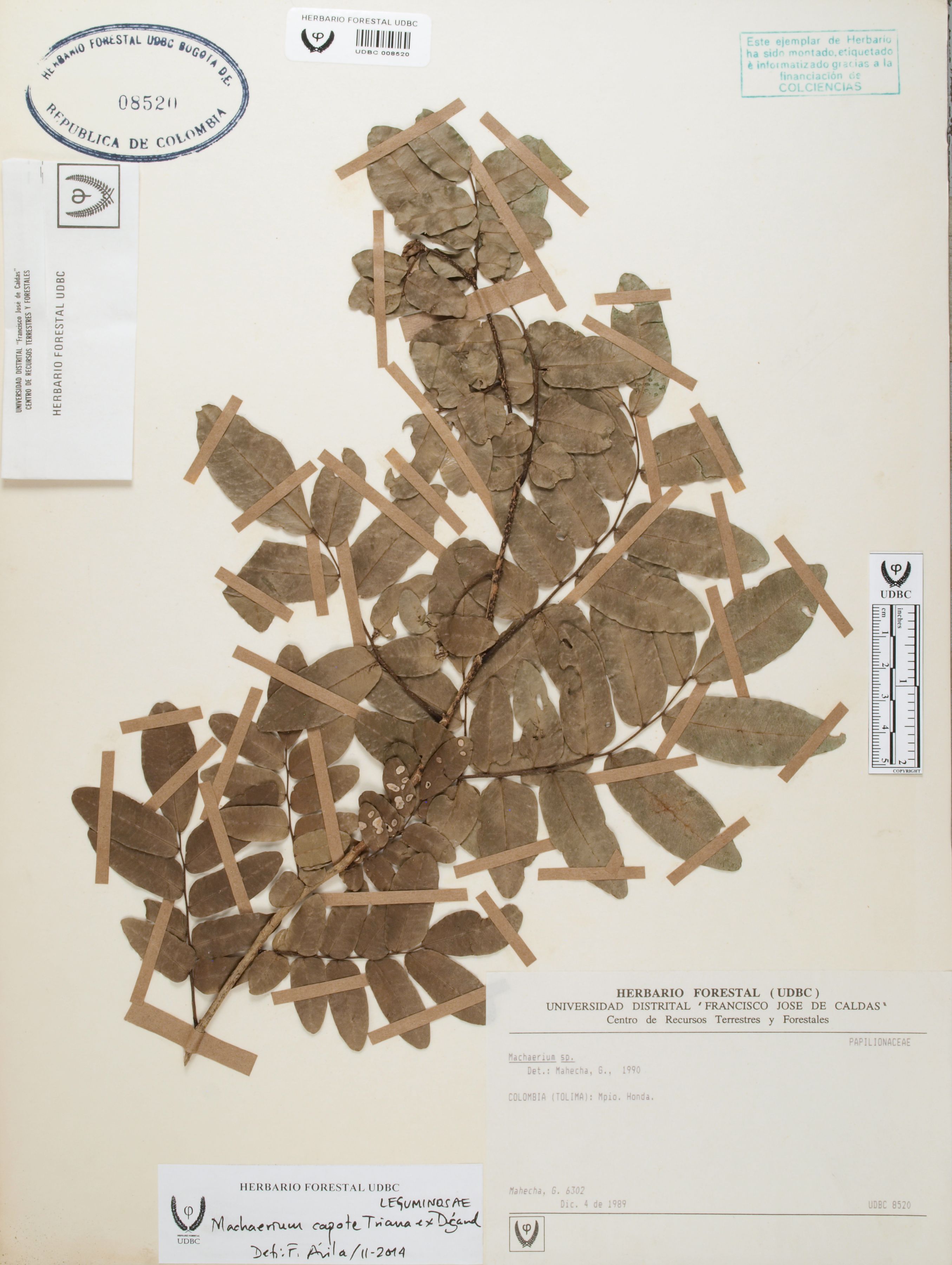 Fotografía del ejemplar Mahecha, G. 6302, determinado como Machaerium capote en el año 2014