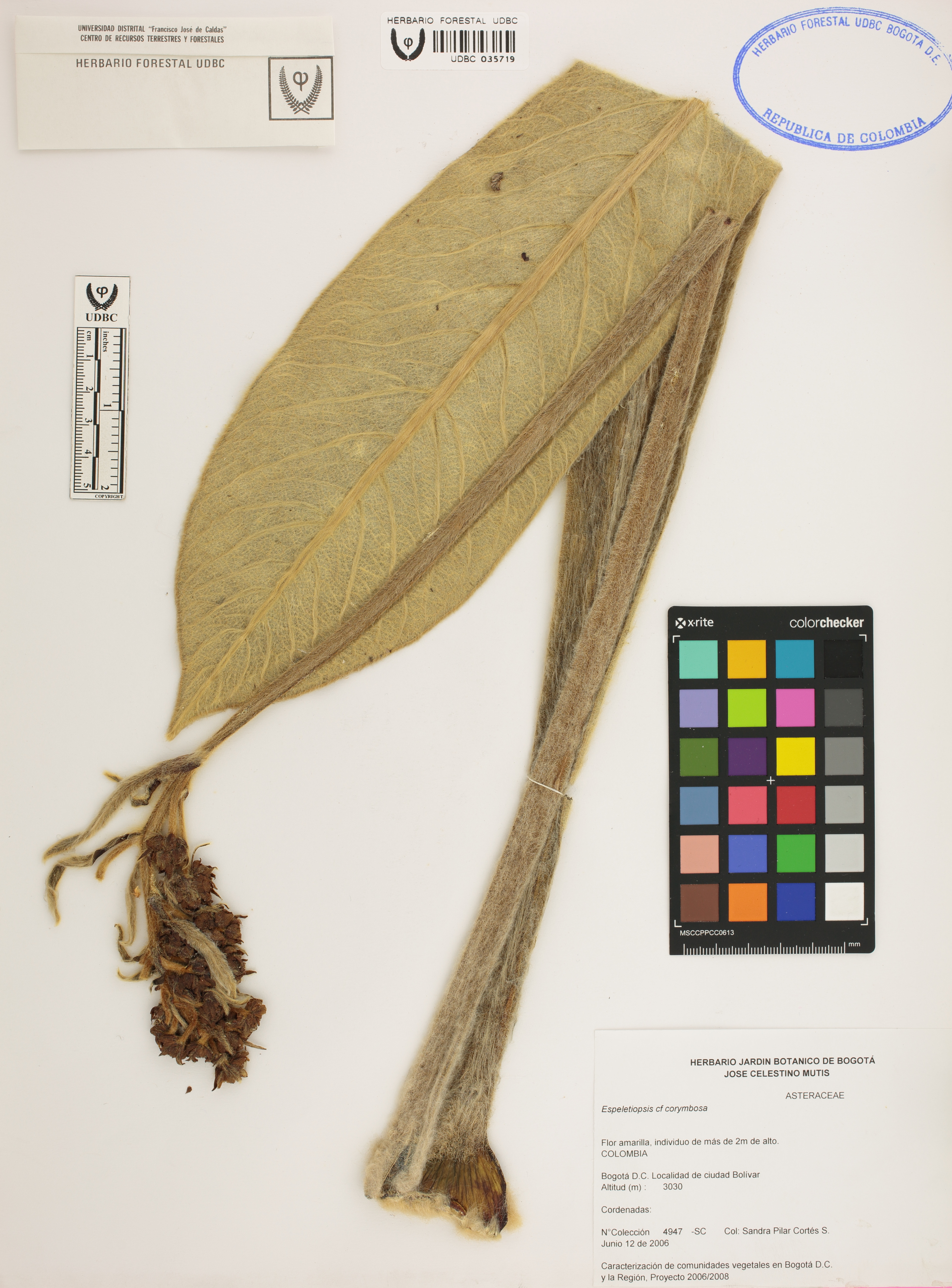 Fotografía del ejemplar Cortés-S., S. 4947, determinado como Espeletiopsis corymbosa