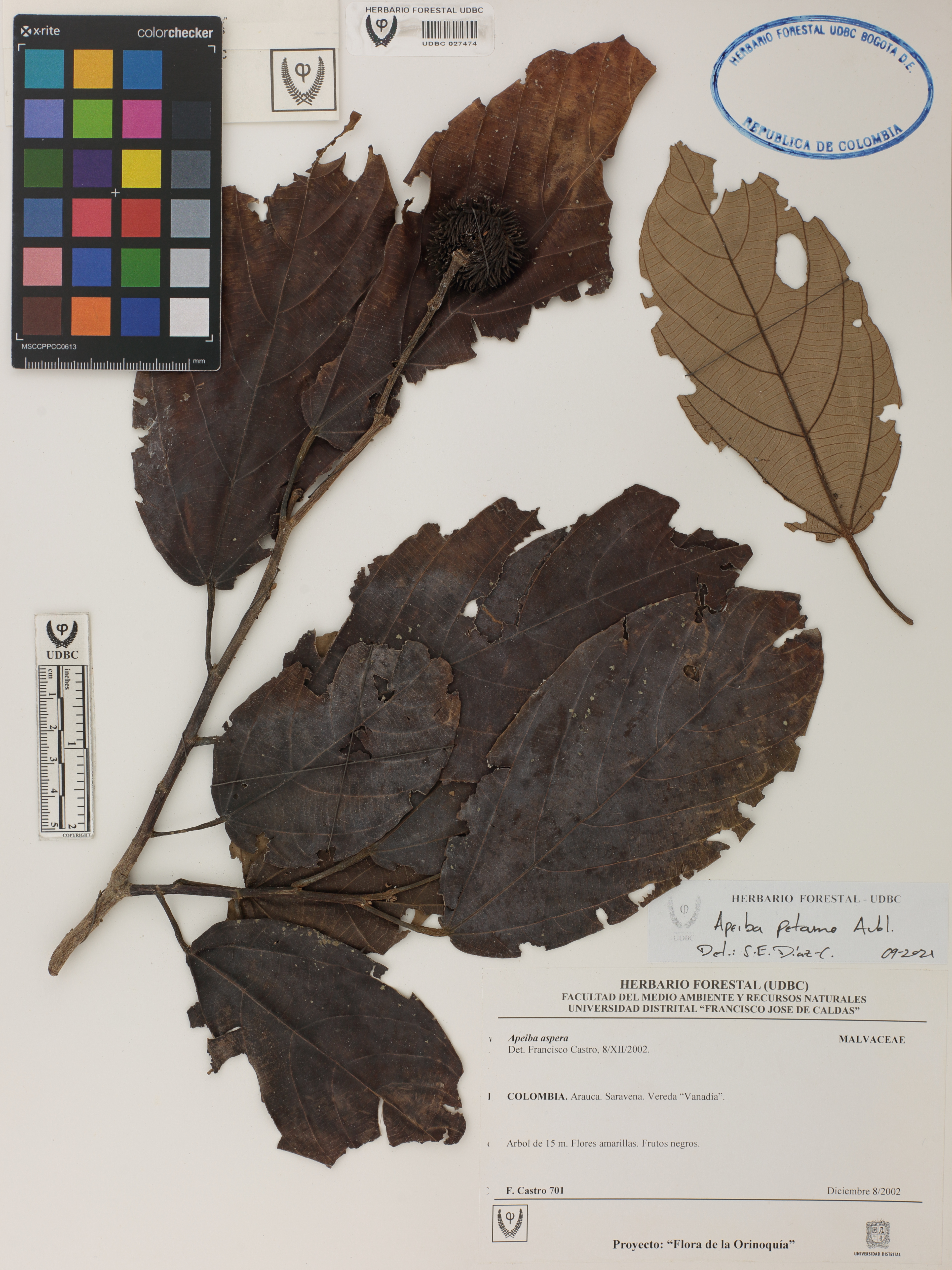 Fotografía del ejemplar Castro, F. 701, determinado como Apeiba petoumo en el año 2021