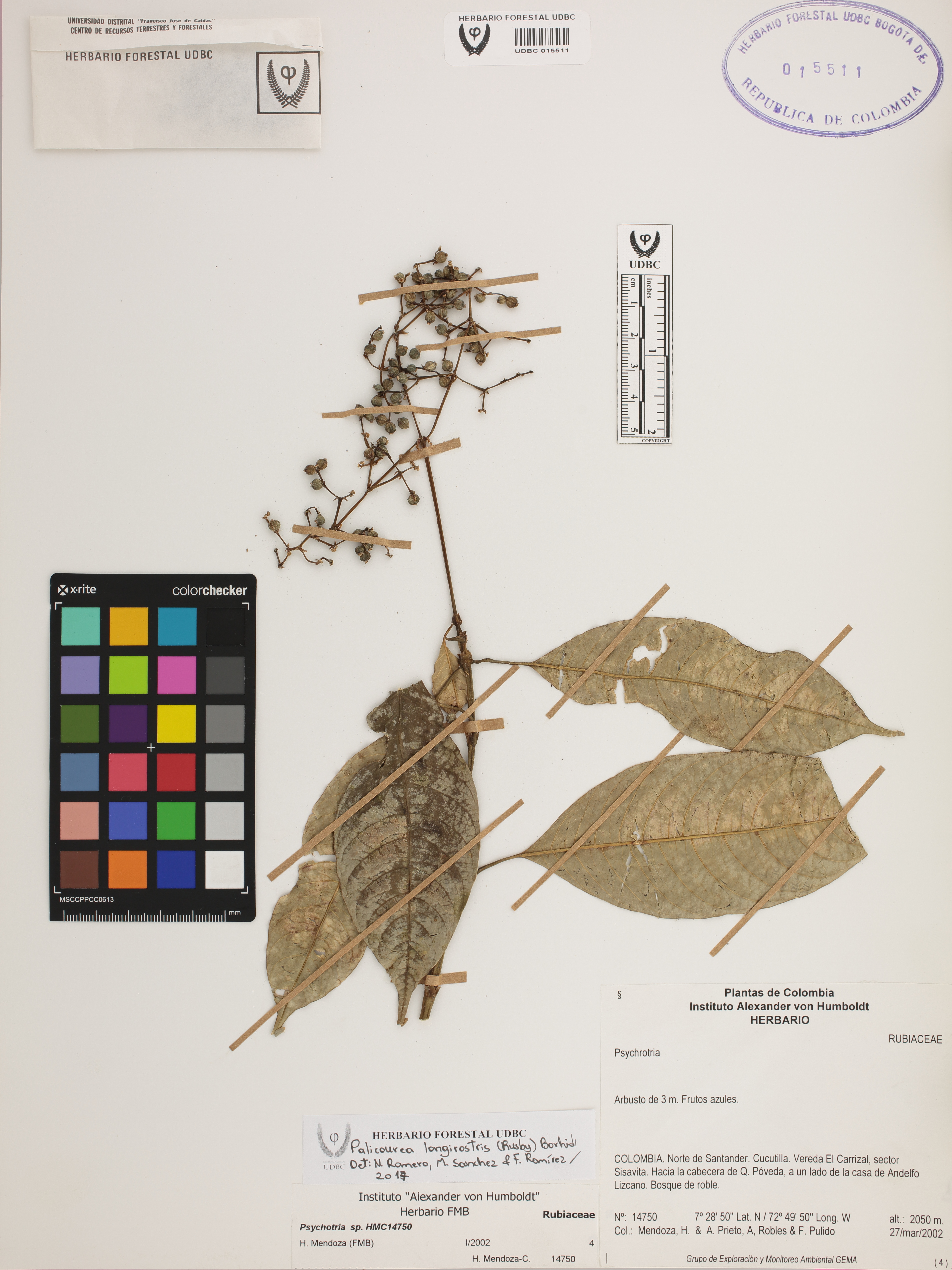 Fotografía del ejemplar Mendoza, H. 14750, determinado como Palicourea longirostris en el año 2017