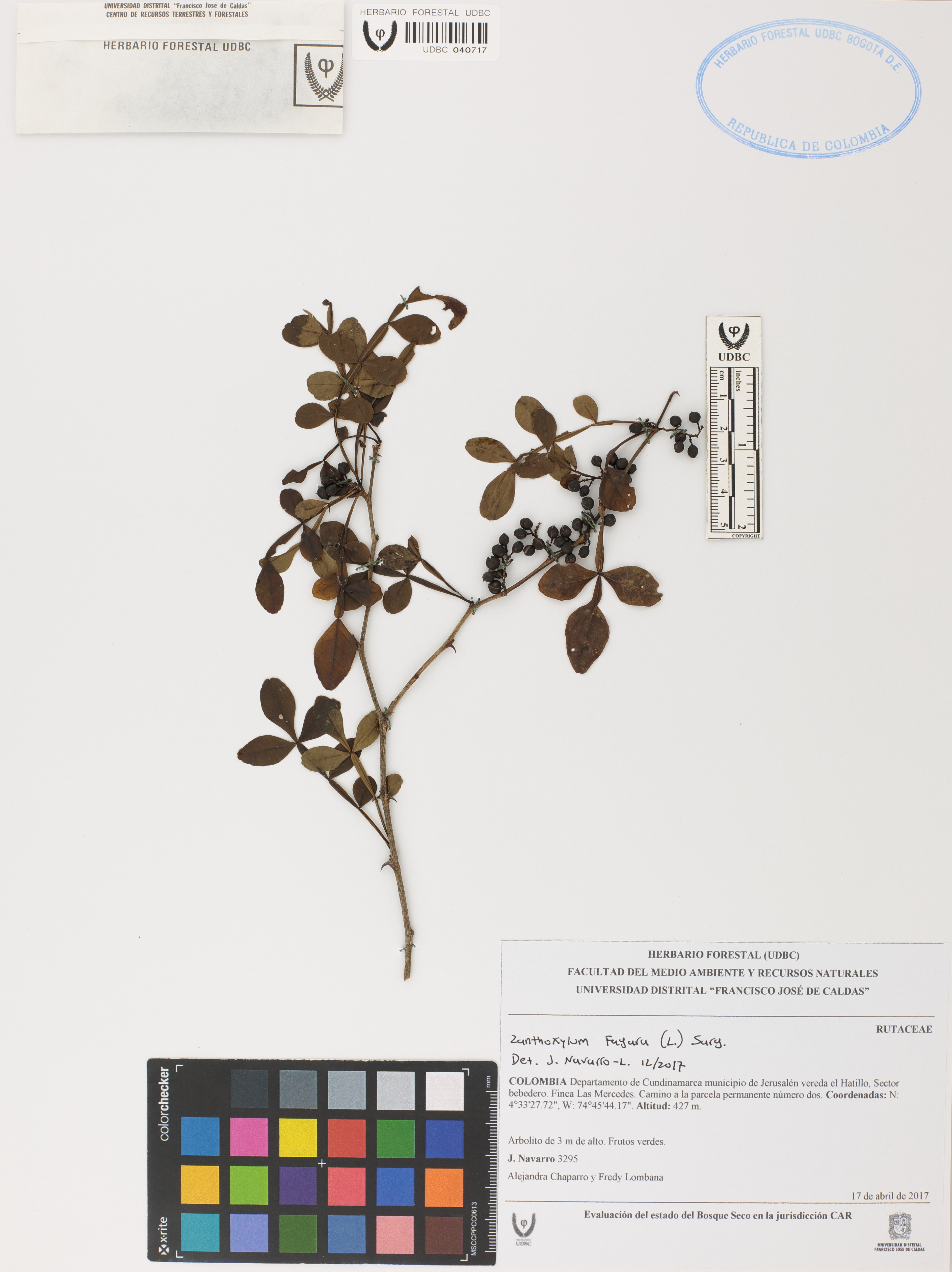 Fotografía del ejemplar Navarro, J. 3295, determinado como Zanthoxylum fagara en el año 2017