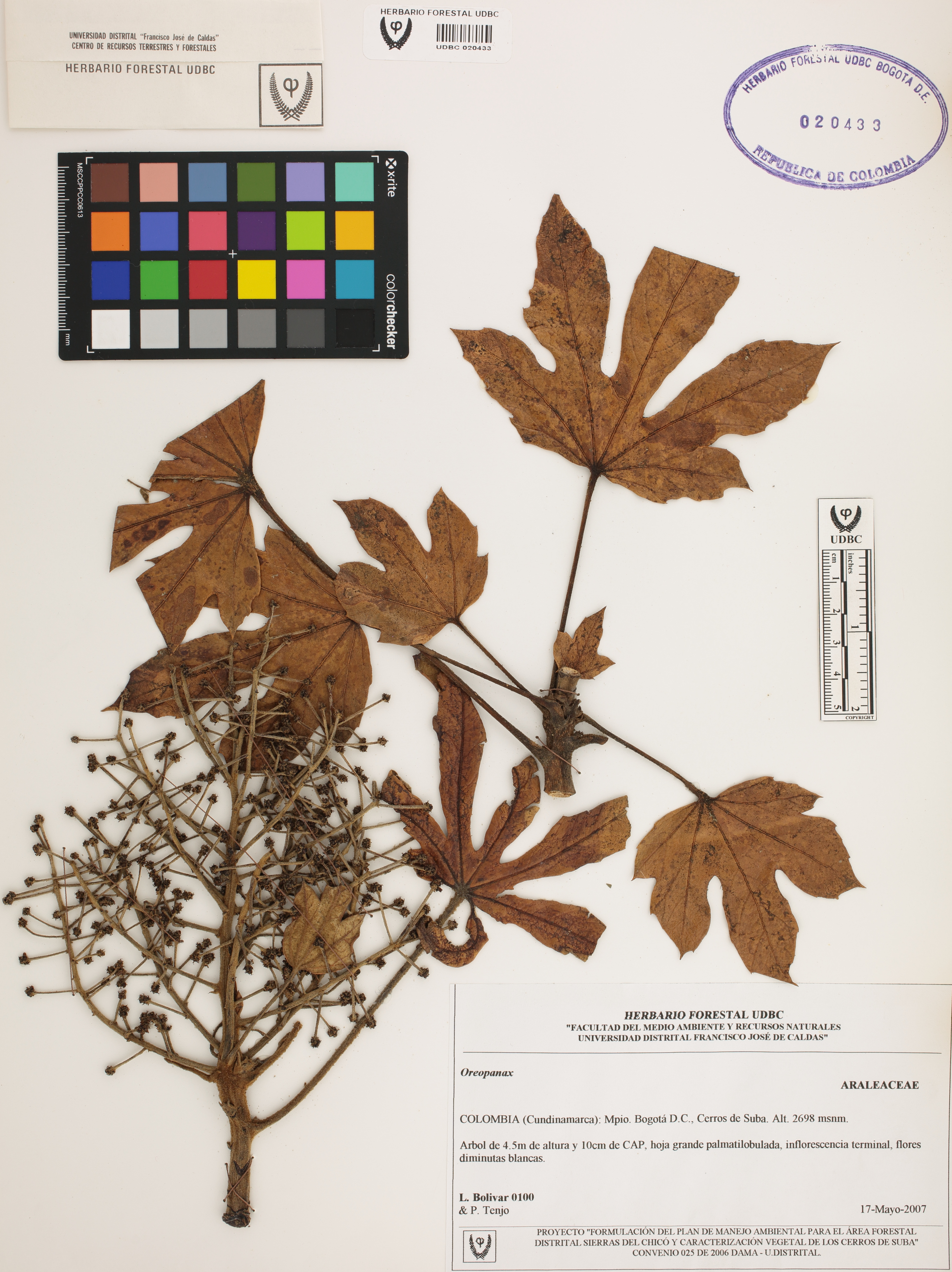 Fotografía del ejemplar Bolívar, L. 100, determinado como Oreopanax sp.