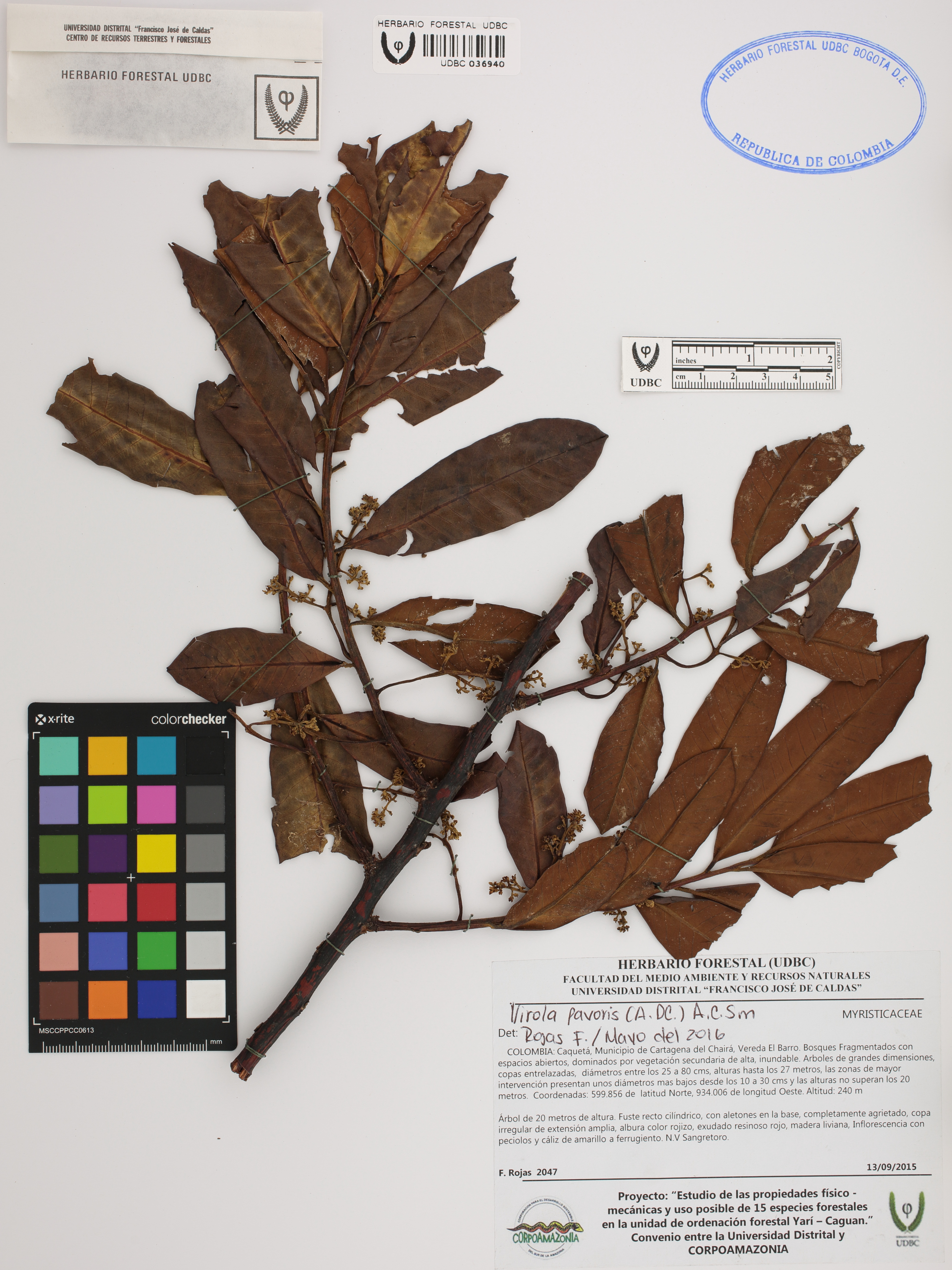 Fotografía del ejemplar Rojas, F. 2047, determinado como Virola pavonis en el año 2016