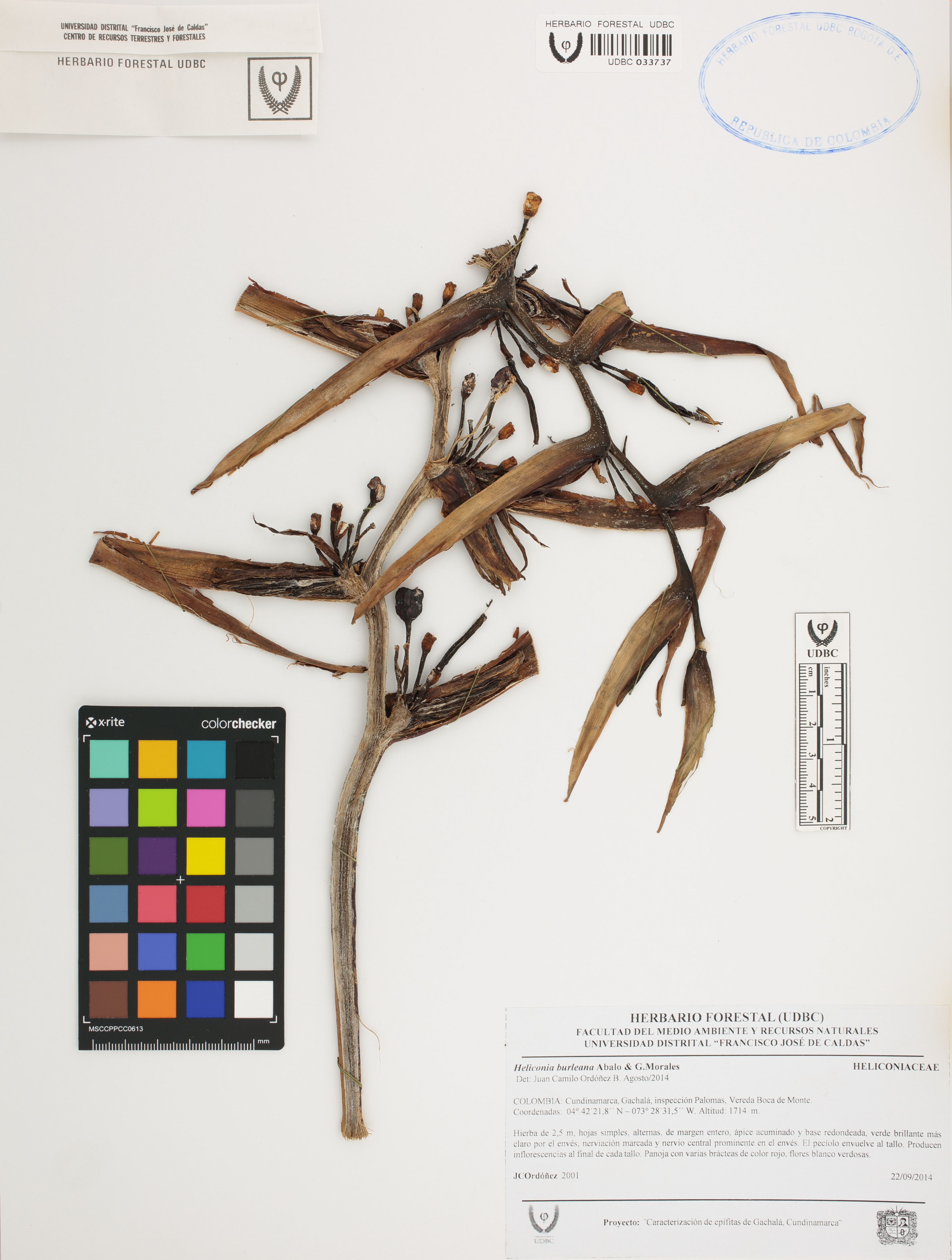 Fotografía del ejemplar Ordóñez, J. 2001, determinado como Heliconia burleana en el año 2014