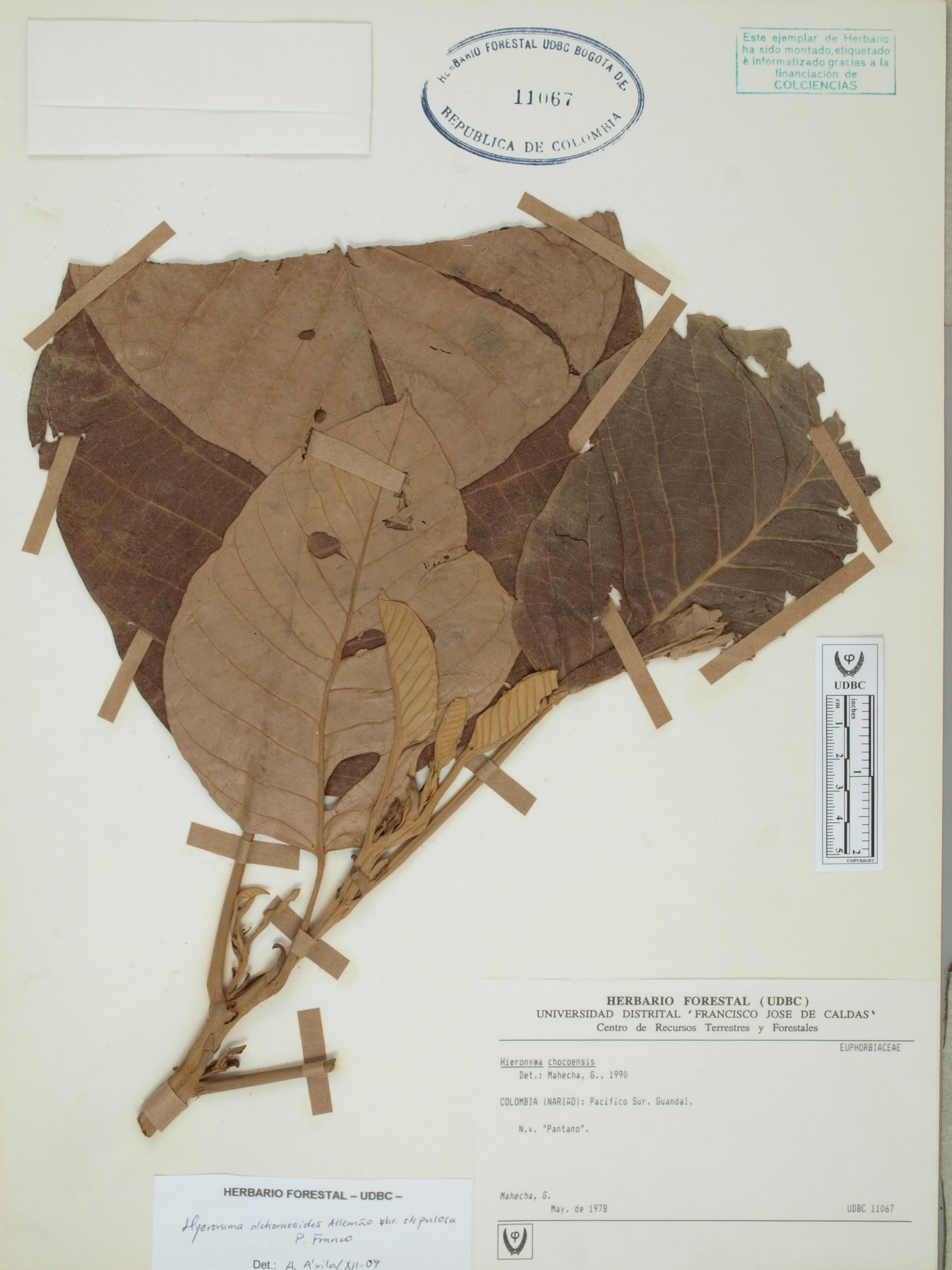 Fotografía del ejemplar Mahecha, G., determinado como Hieronyma alchorneoides var. stipulosa en el año 2007