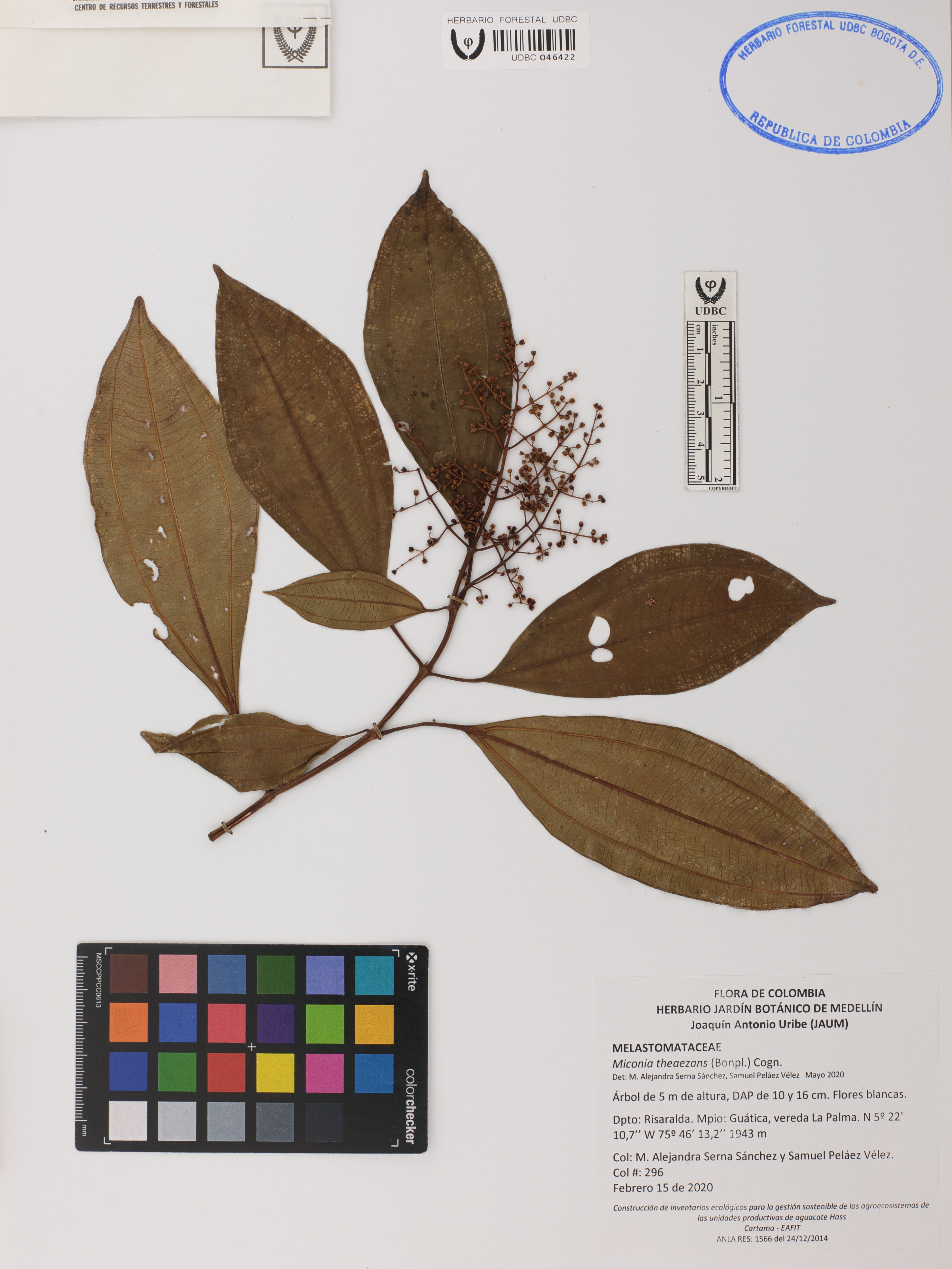 Fotografía del ejemplar Serna-Sánchez, M. 296, determinado como Miconia theaezans en el año 2020