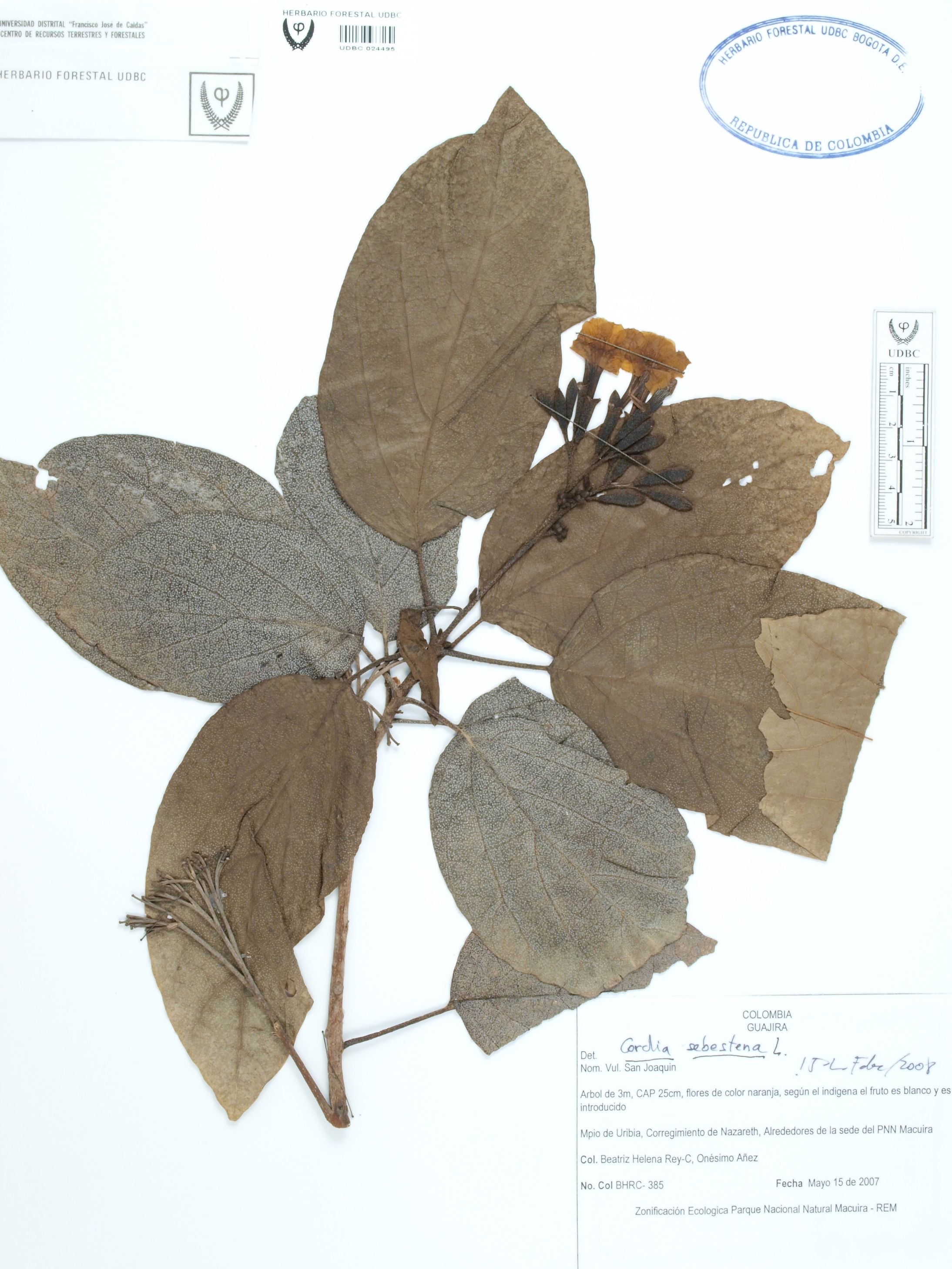 Fotografía del ejemplar Rey-C., B. 385, determinado como Cordia sebestena en el año 2008