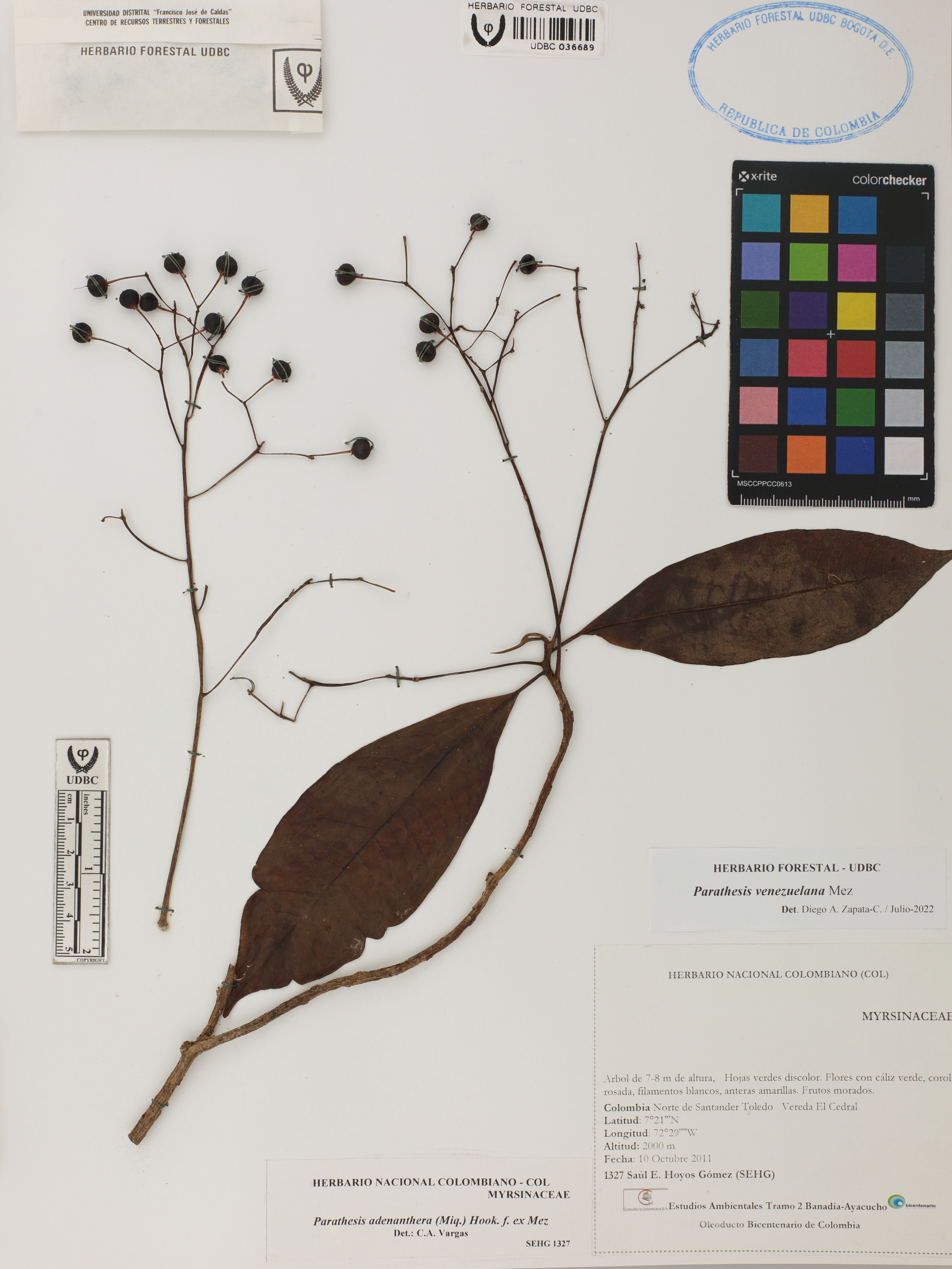 Fotografía del ejemplar Hoyos, S. 1327, determinado como Parathesis venezuelana en el año 2022