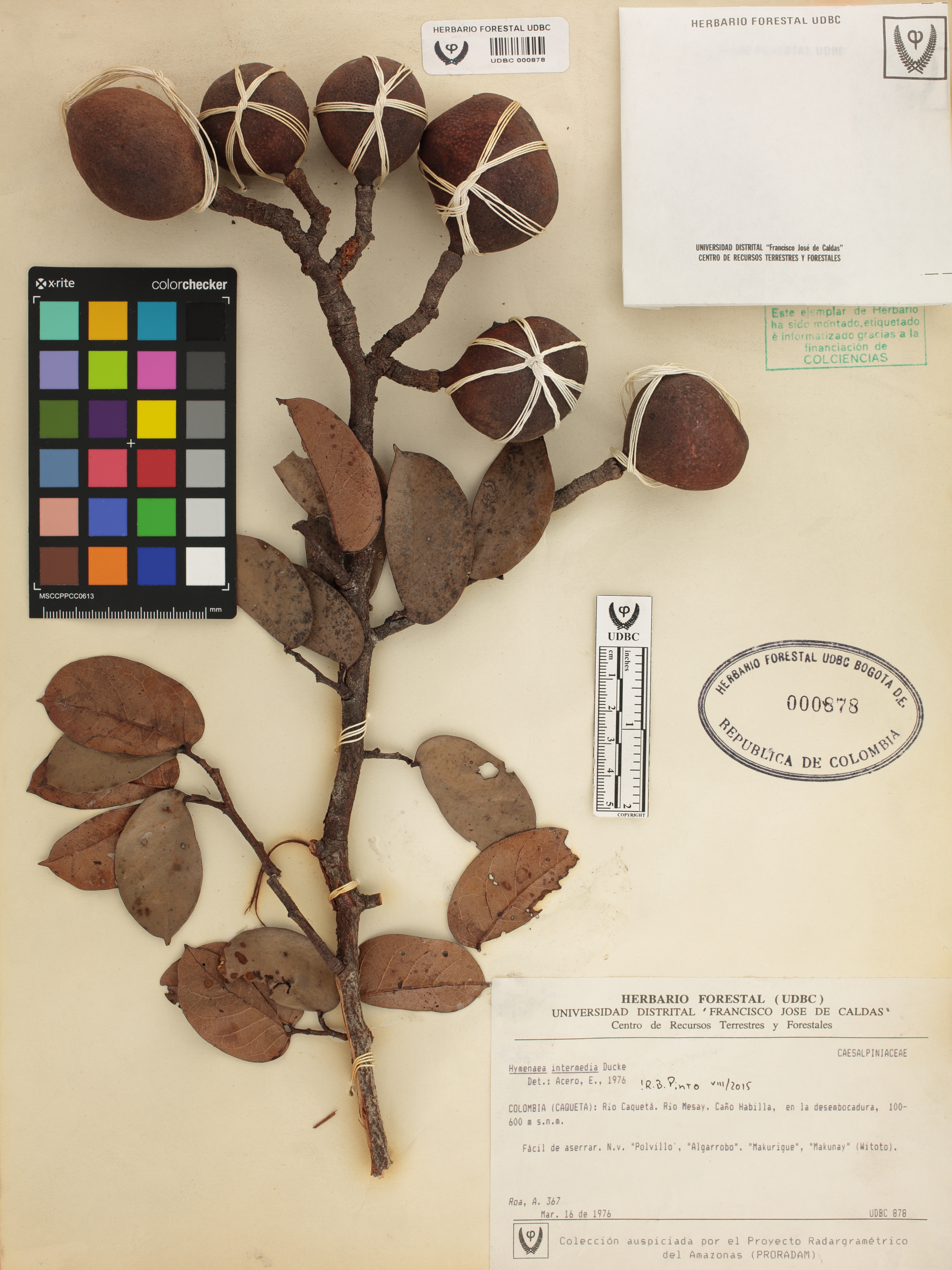 Fotografía del ejemplar Roa, A. 367, determinado como Hymenaea intermedia en el año 1976