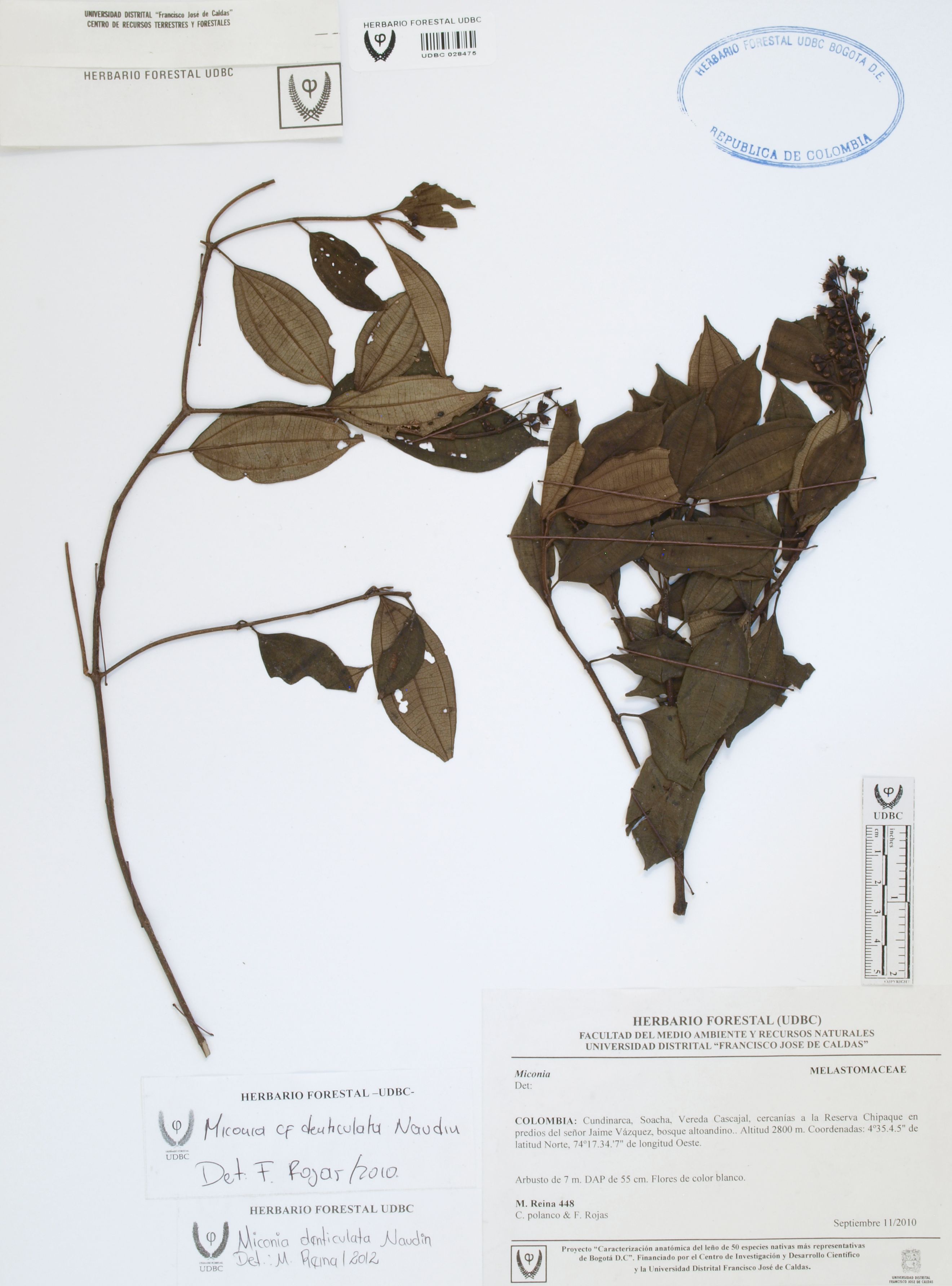 Fotografía del ejemplar Reina, M. 448, determinado como Miconia denticulata en el año 2012