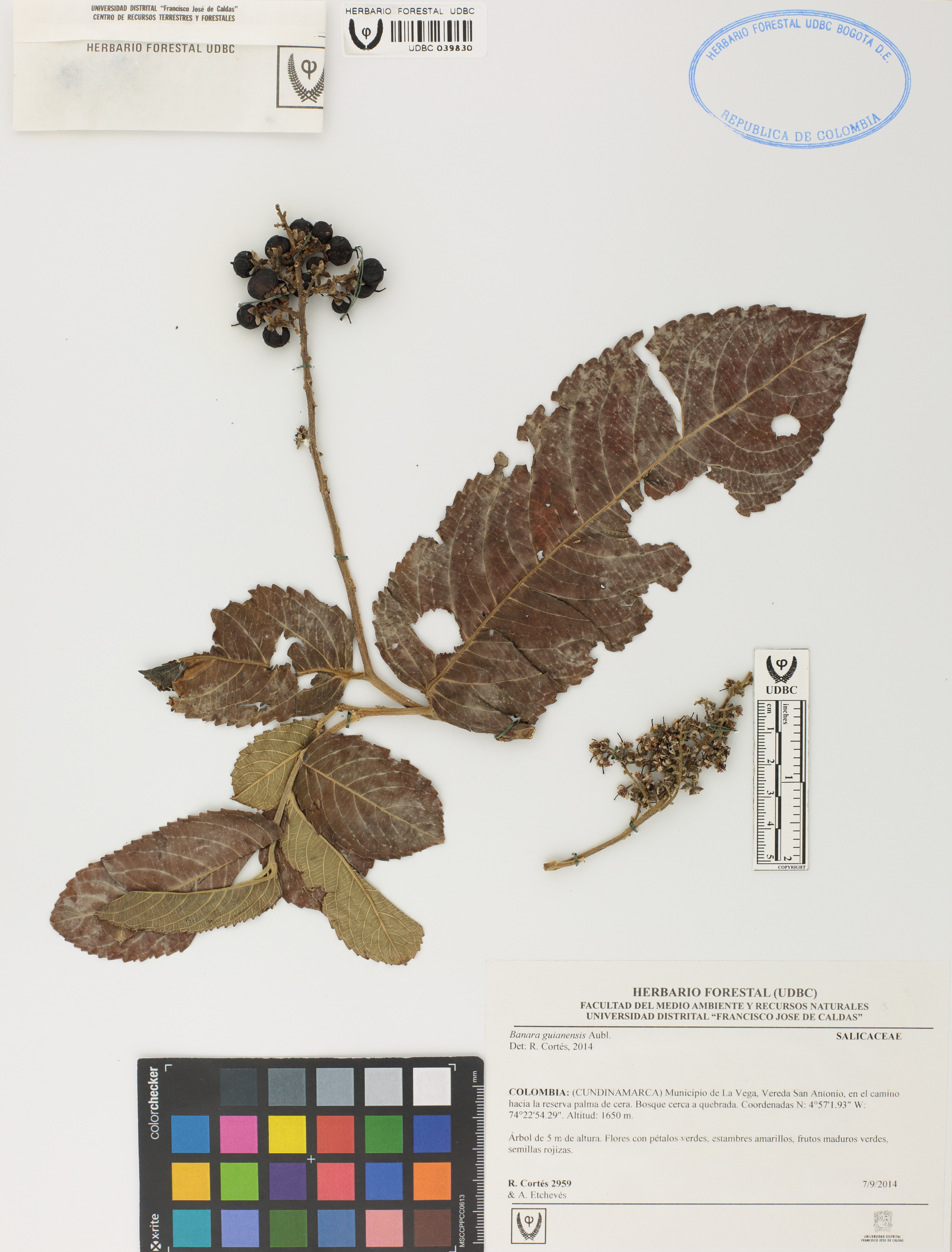 Fotografía del ejemplar Cortés, R. 2959, determinado como Banara guianensis en el año 2014