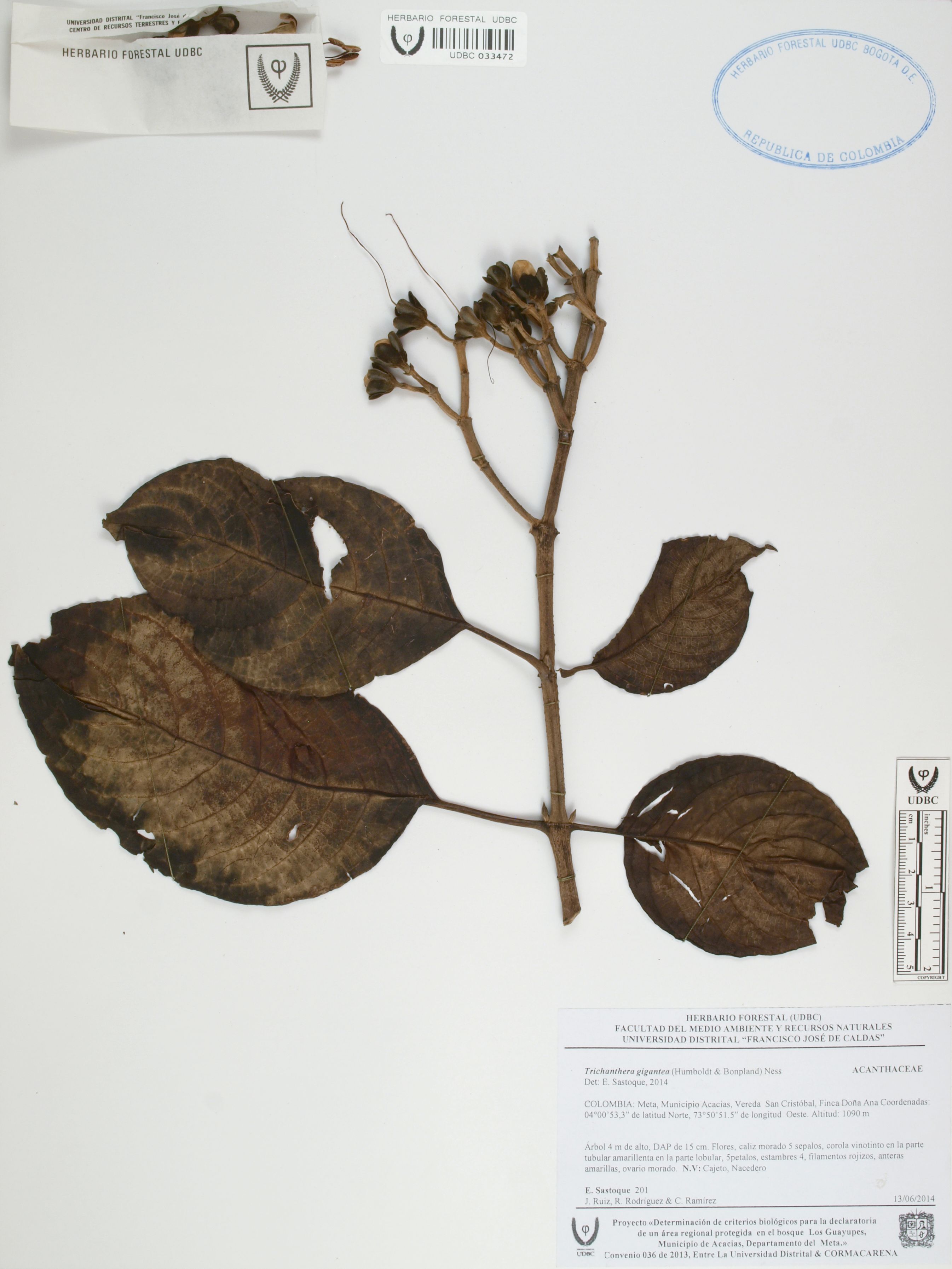 Fotografía del ejemplar Sastoque, E. 201, determinado como Trichanthera gigantea en el año 2014
