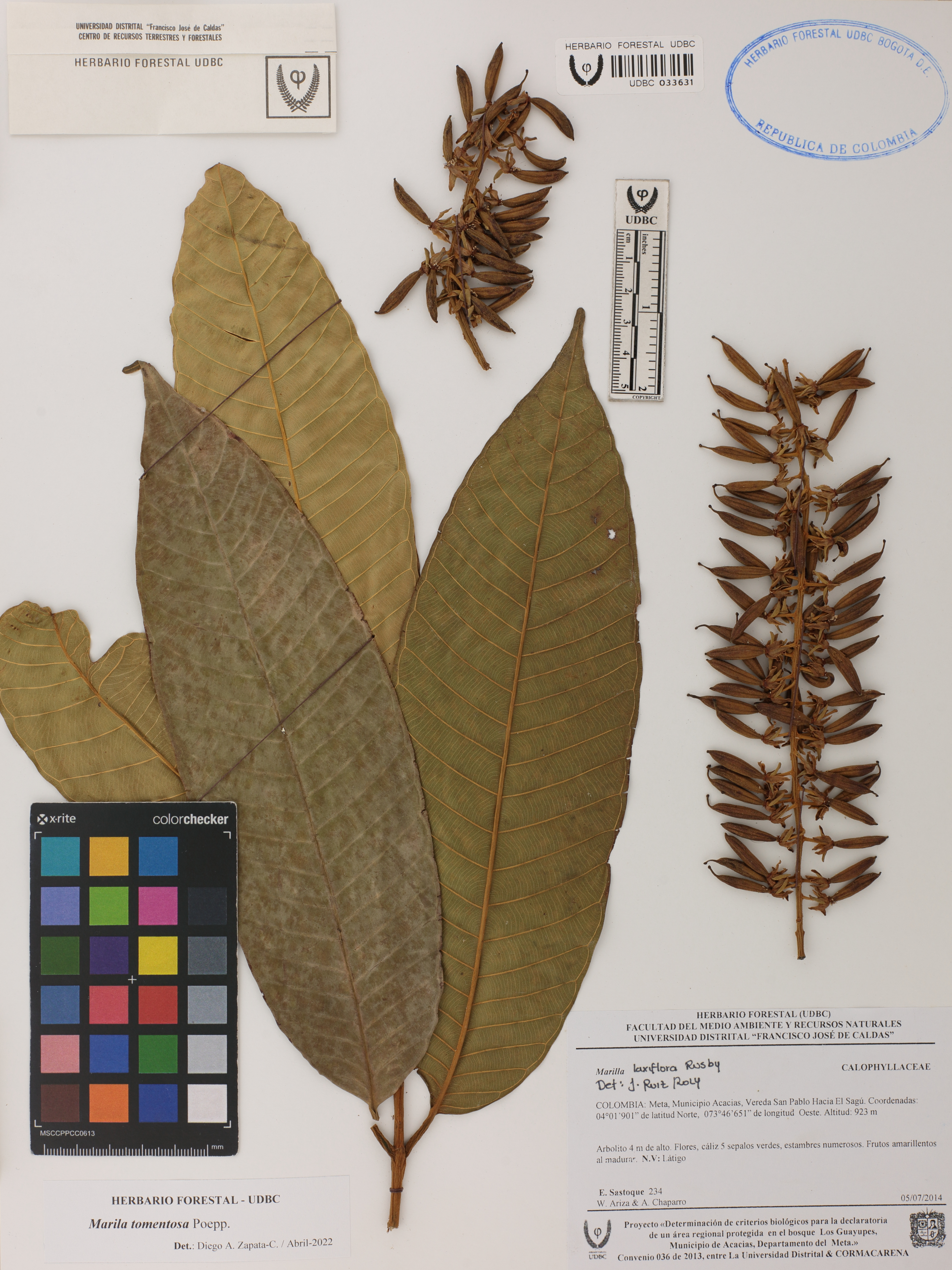 Fotografía del ejemplar Sastoque, E. 234, determinado como Marila tomentosa en el año 2022