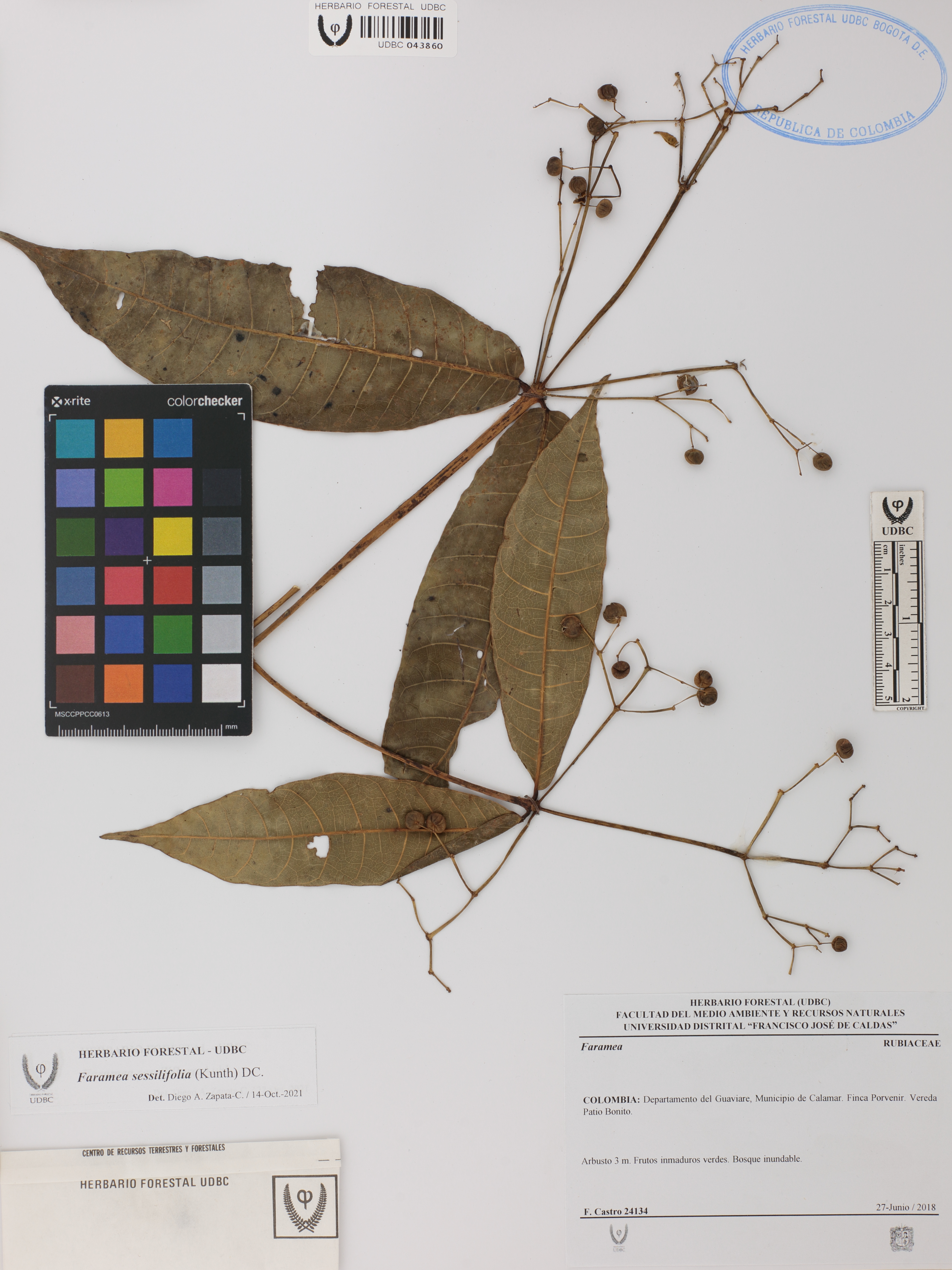 Fotografía del ejemplar Castro, F. 24134, determinado como Faramea sessilifolia en el año 2021