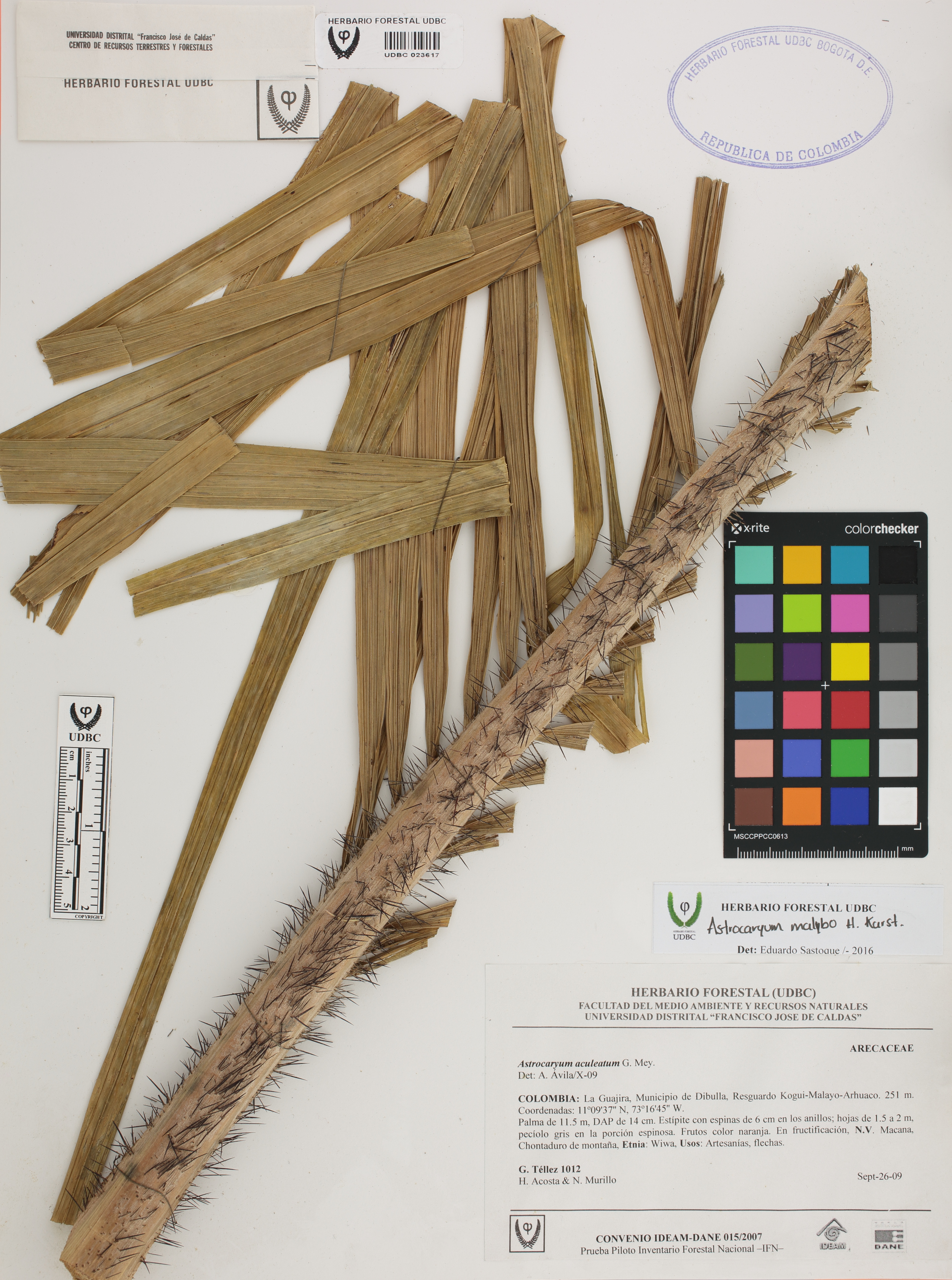 Fotografía del ejemplar Téllez, G. 1012, determinado como Astrocaryum malybo en el año 2016