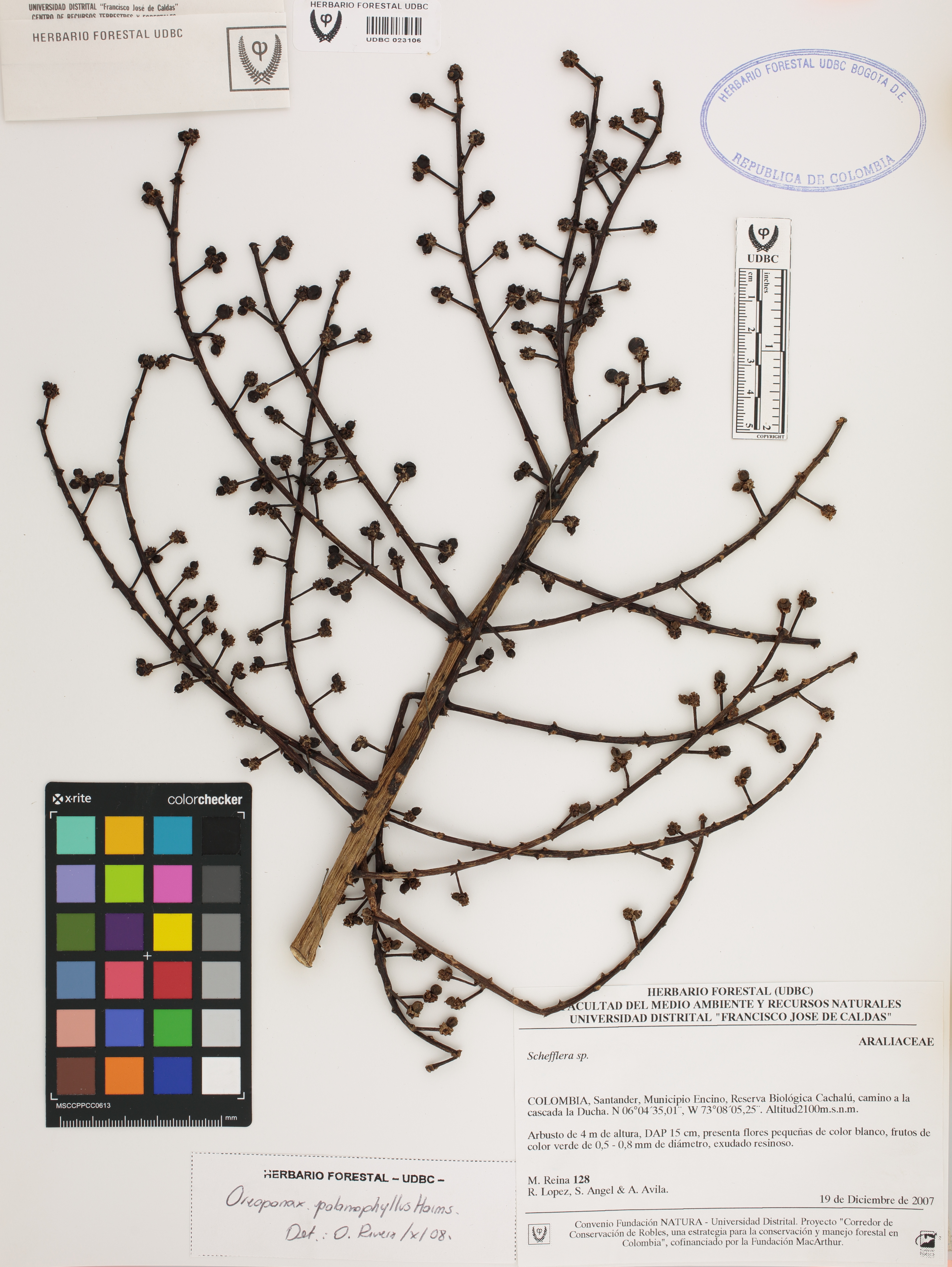 Fotografía del ejemplar Reina, M. 128, determinado como Oreopanax palamophyllus en el año 2008