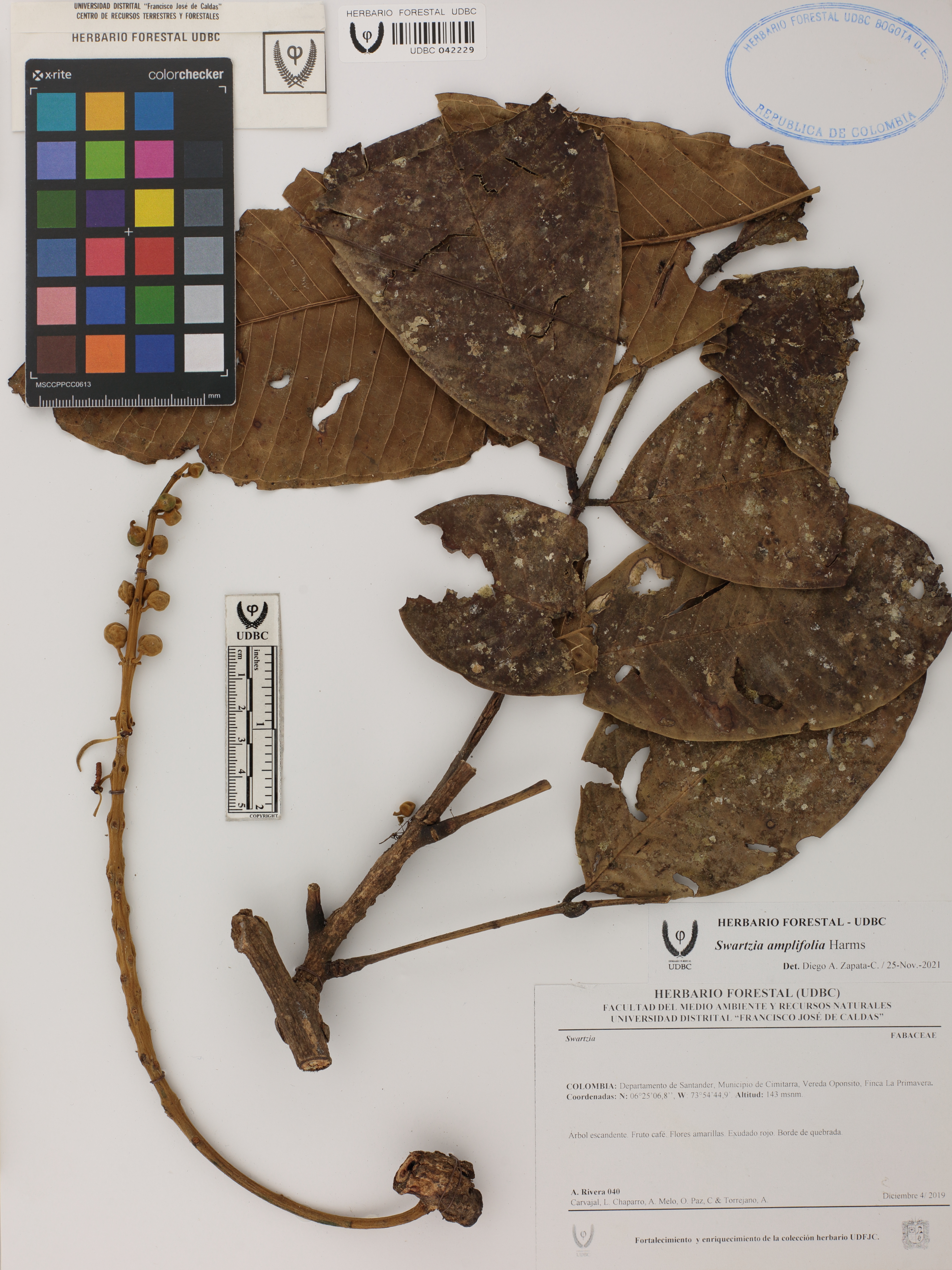Fotografía del ejemplar Rivera, A. 40, determinado como Swartzia amplifolia en el año 2021