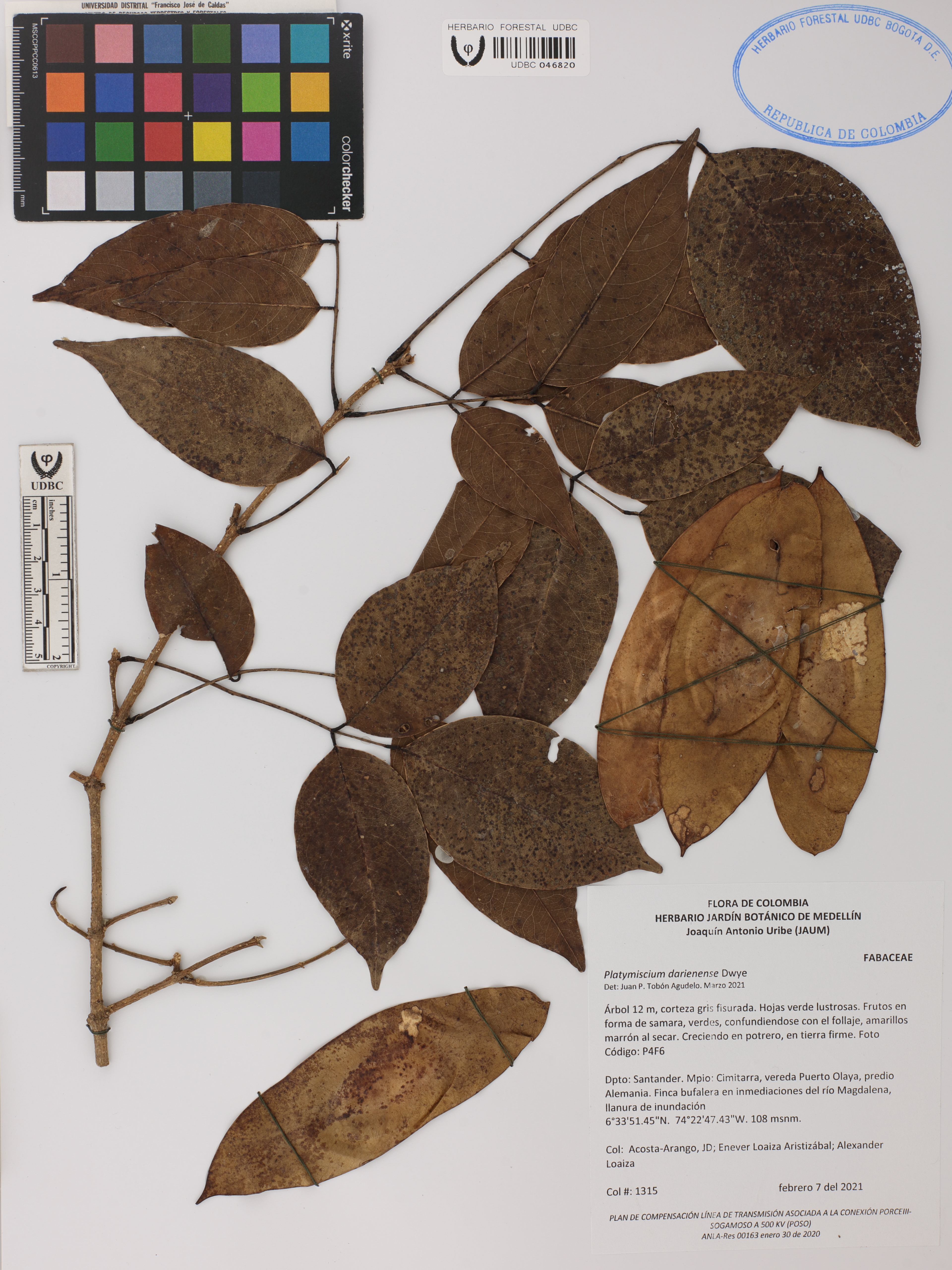 Fotografía del ejemplar Acosta-Arango, J. 1315, determinado como Platymiscium darienense en el año 2021