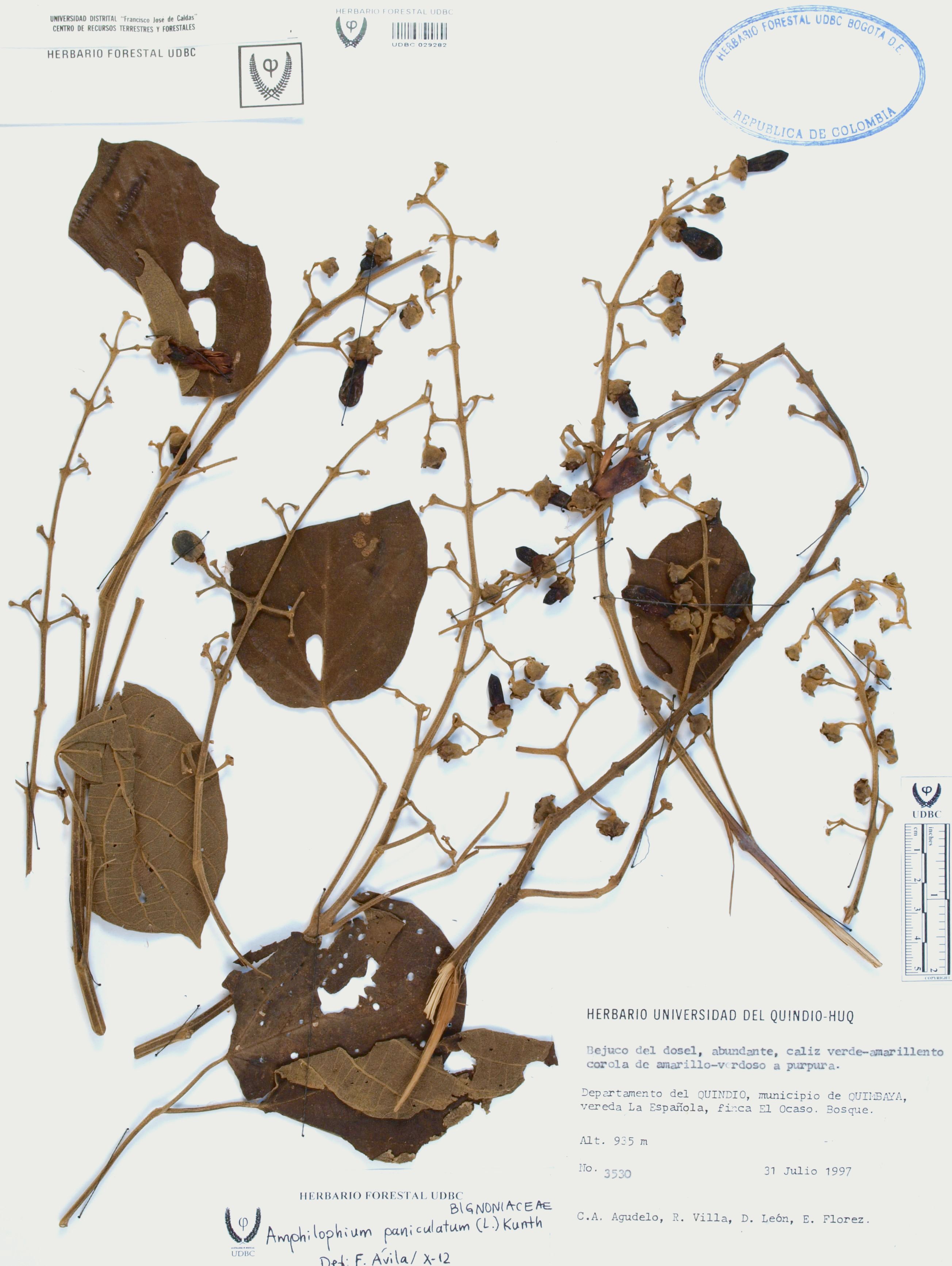| dc.description | Fotografía del ejemplar Agudelo, C. 3530, determinado como Amphilophium paniculatum en el año 2012 | |
