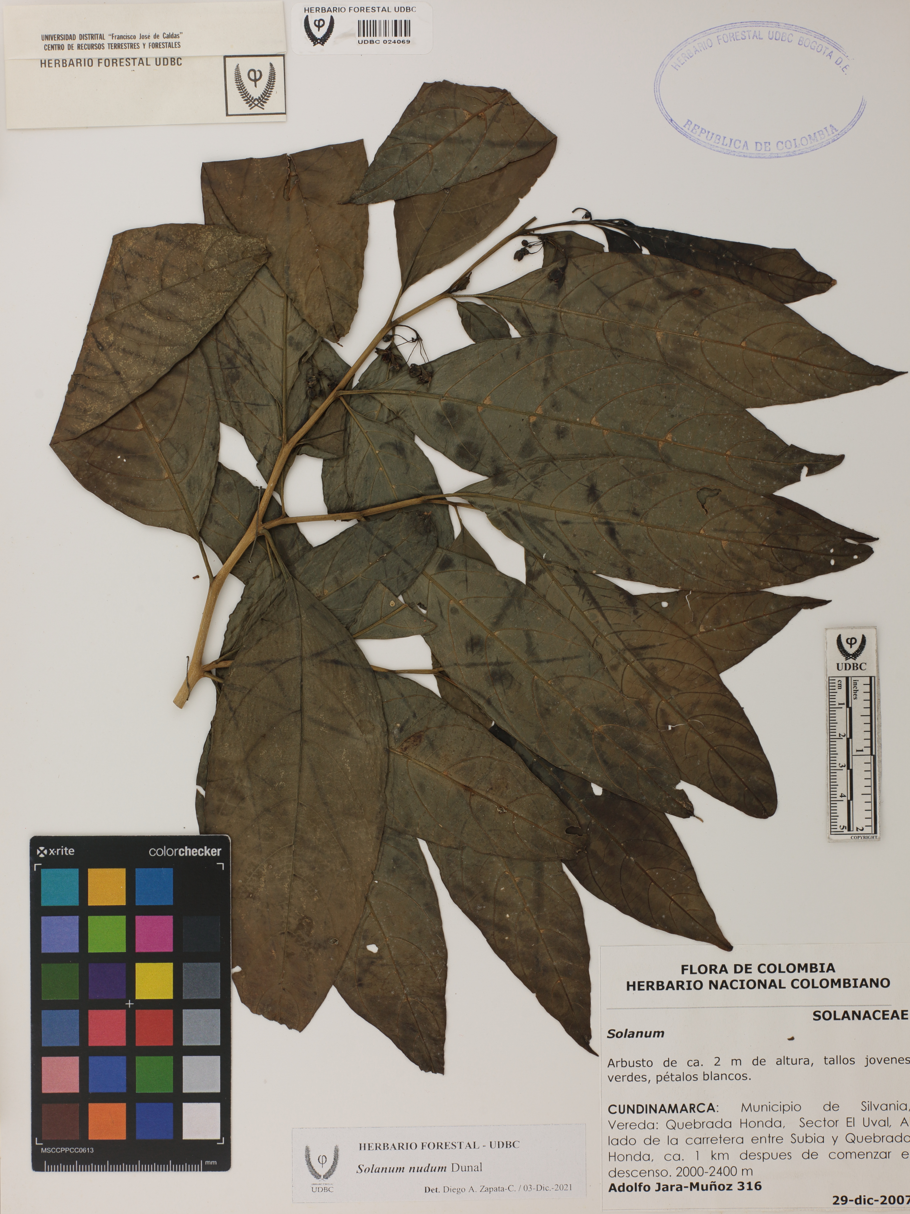 Fotografía del ejemplar Jara, A. 316, determinado como Solanum nudum en el año 2021