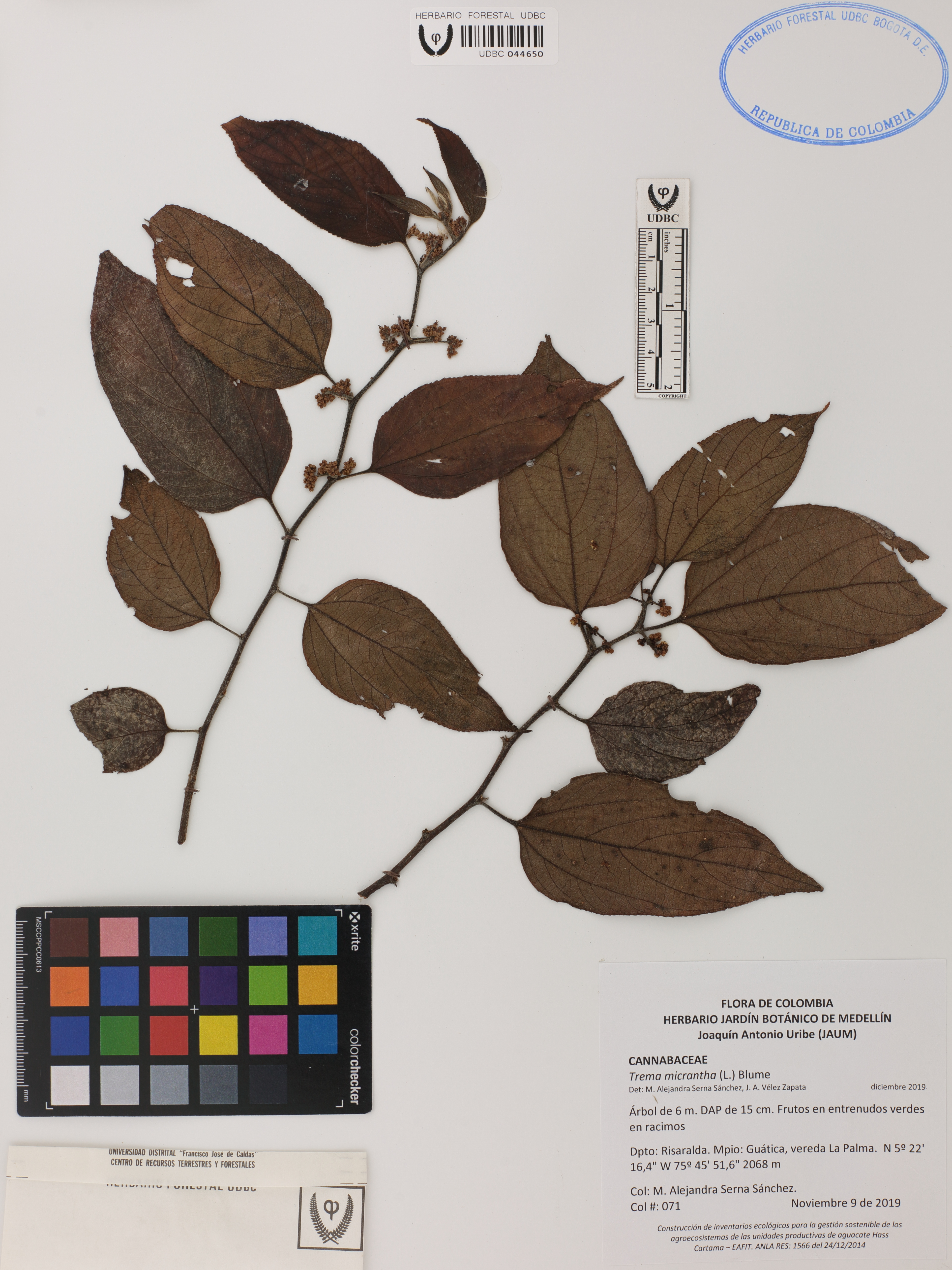 Fotografía del ejemplar Serna-Sánchez, M. 71, determinado como Trema micranthum en el año 2019