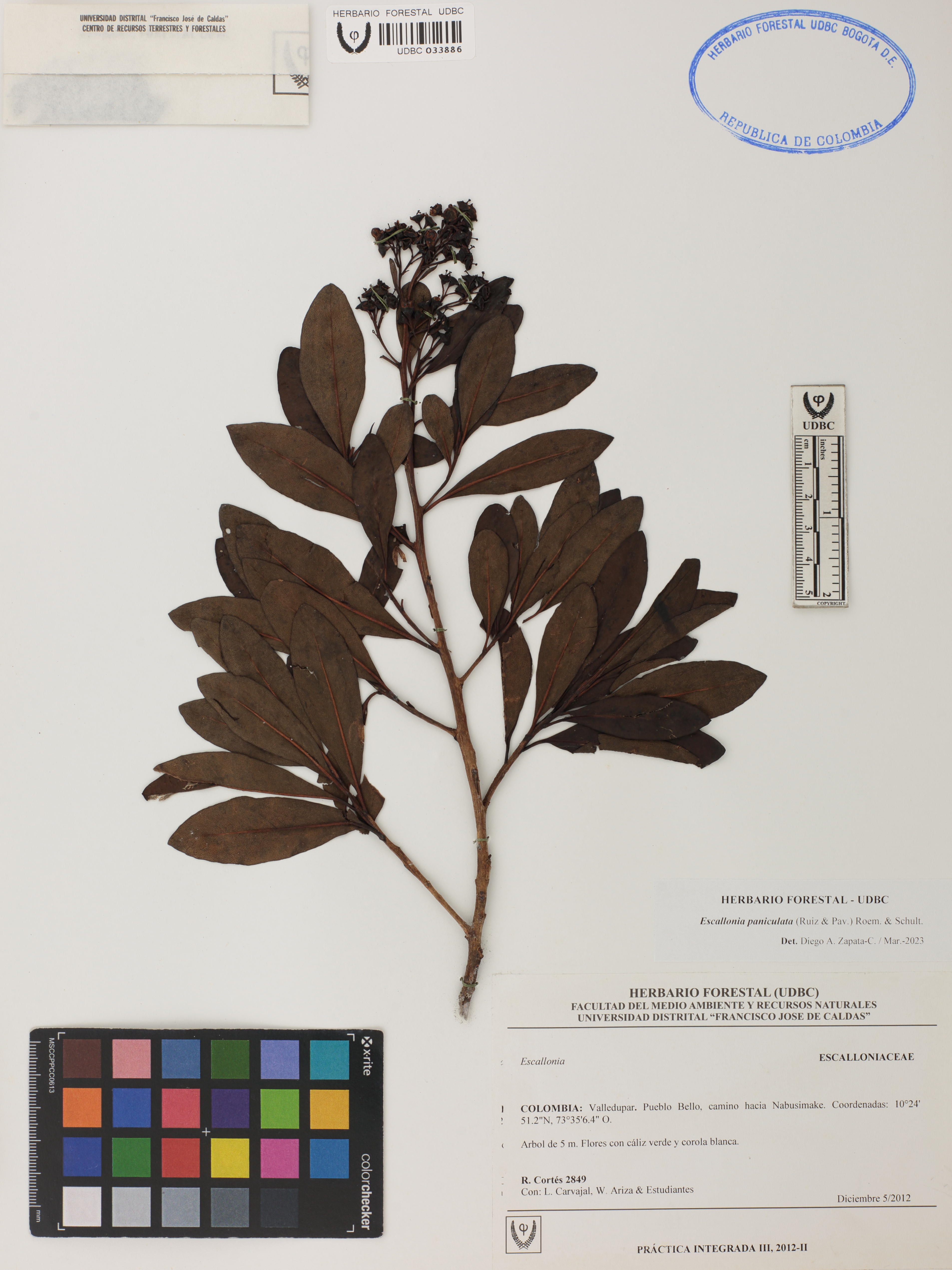 Fotografía del ejemplar Cortés, R. 2849, determinado como Escallonia paniculata en el año 2023