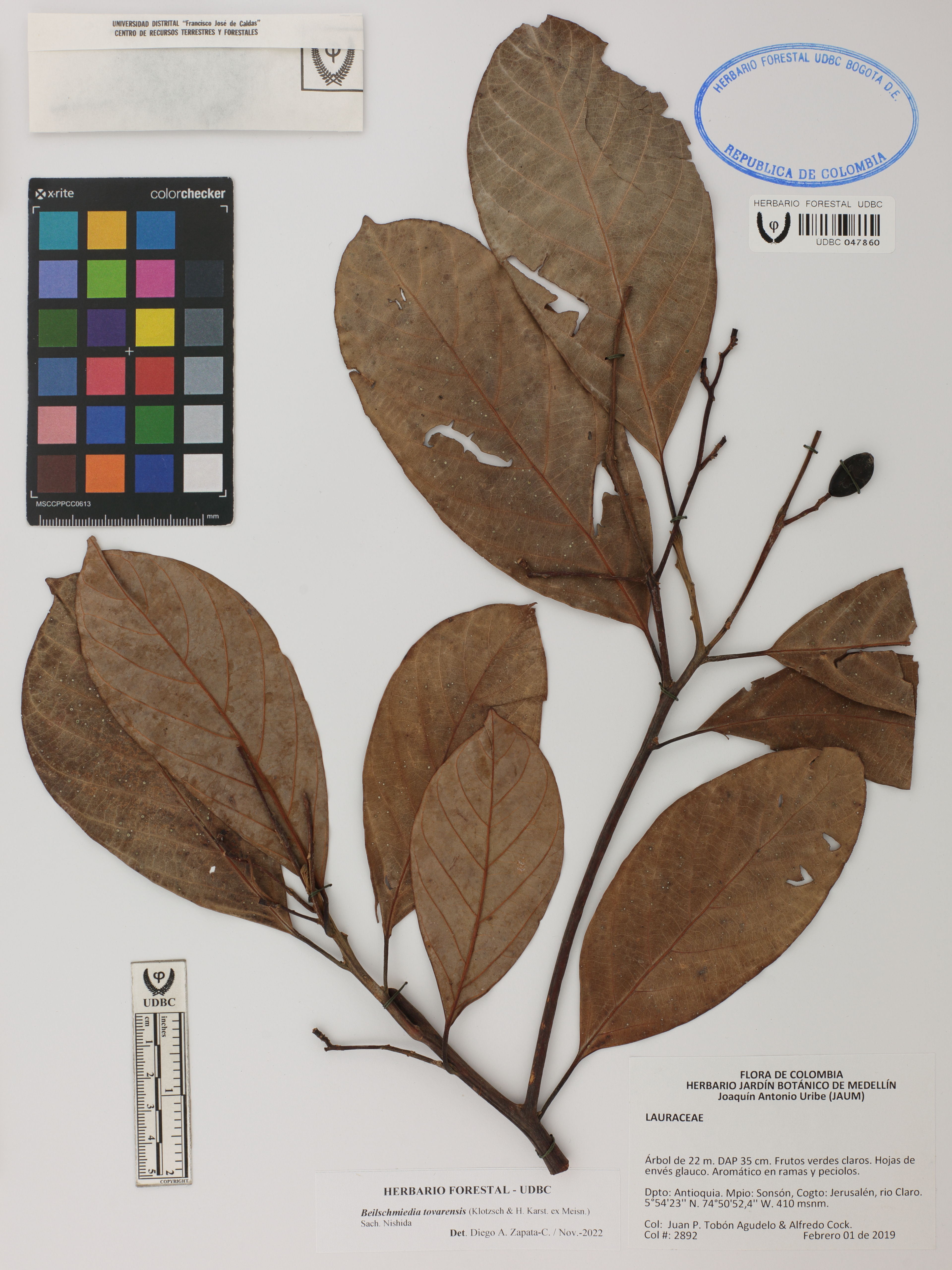 | dc.description | Fotografía del ejemplar Tobón-Agudelo, J. 2892, determinado como Beilschmiedia tovarensis en el año 2022 | |
