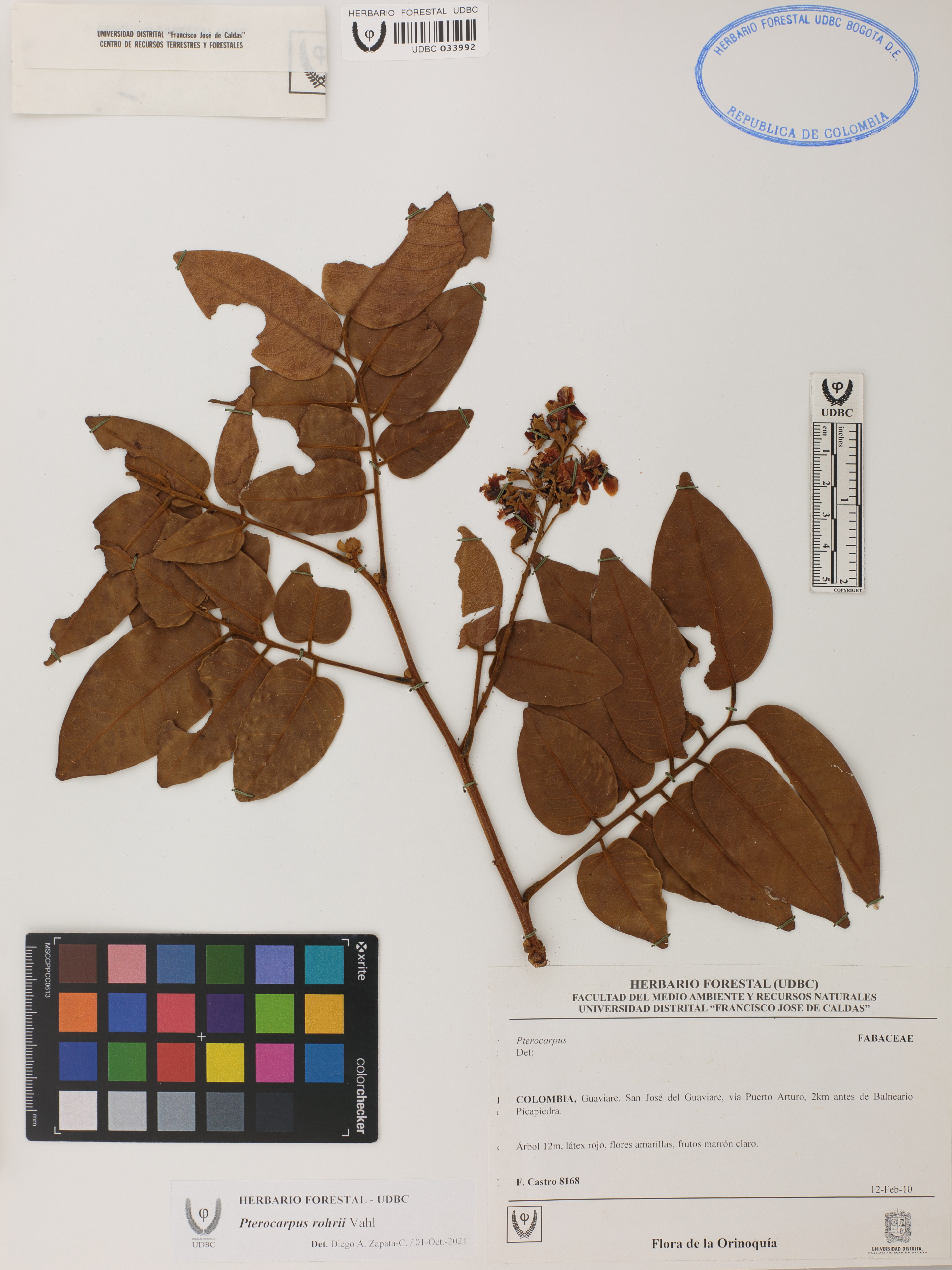 Fotografía del ejemplar Castro, F. 8168, determinado como Pterocarpus rohrii en el año 2021