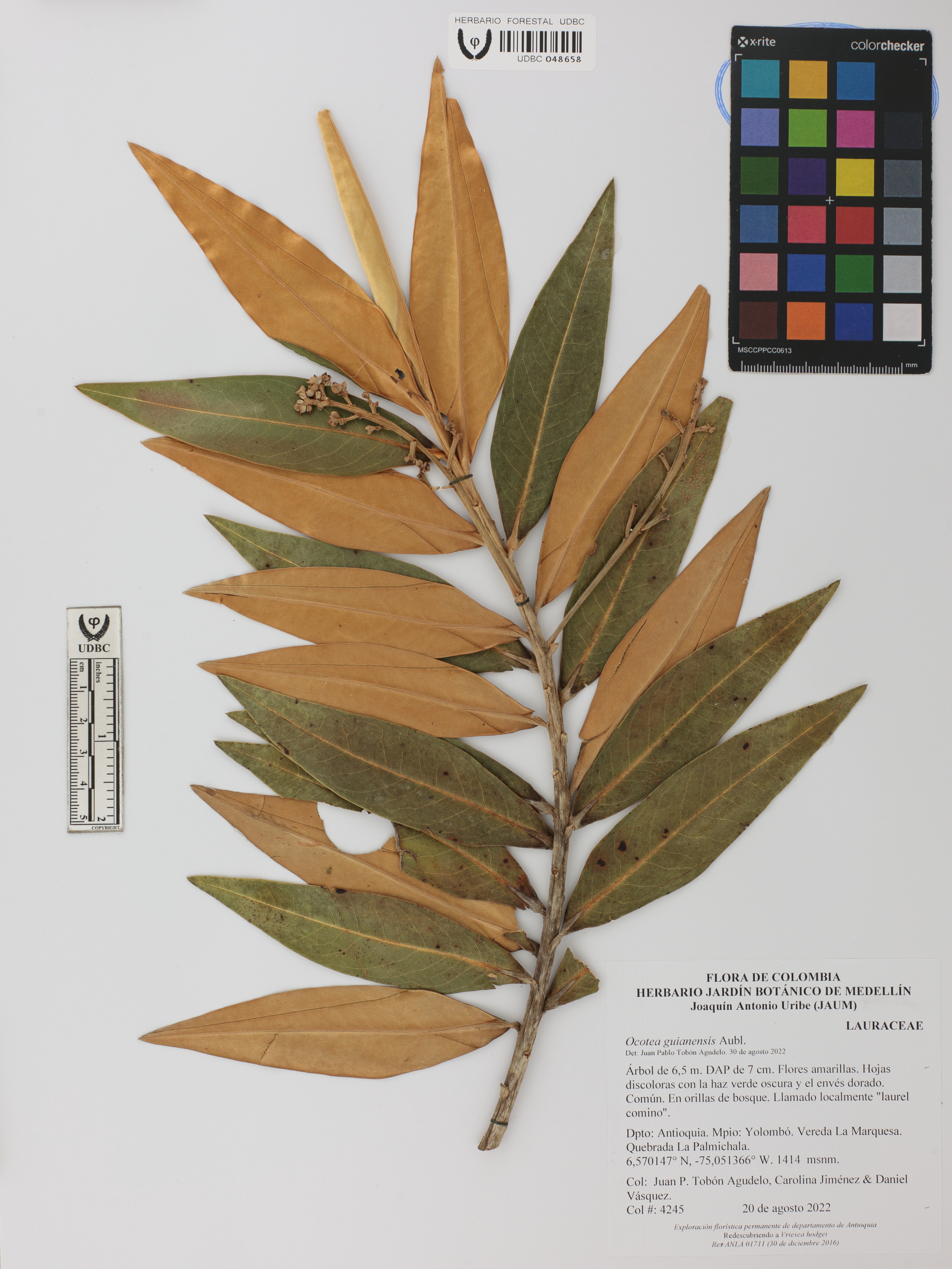 Fotografía del ejemplar Tobón-A., J. 4245, determinado como Ocotea guianensis en el año 2022