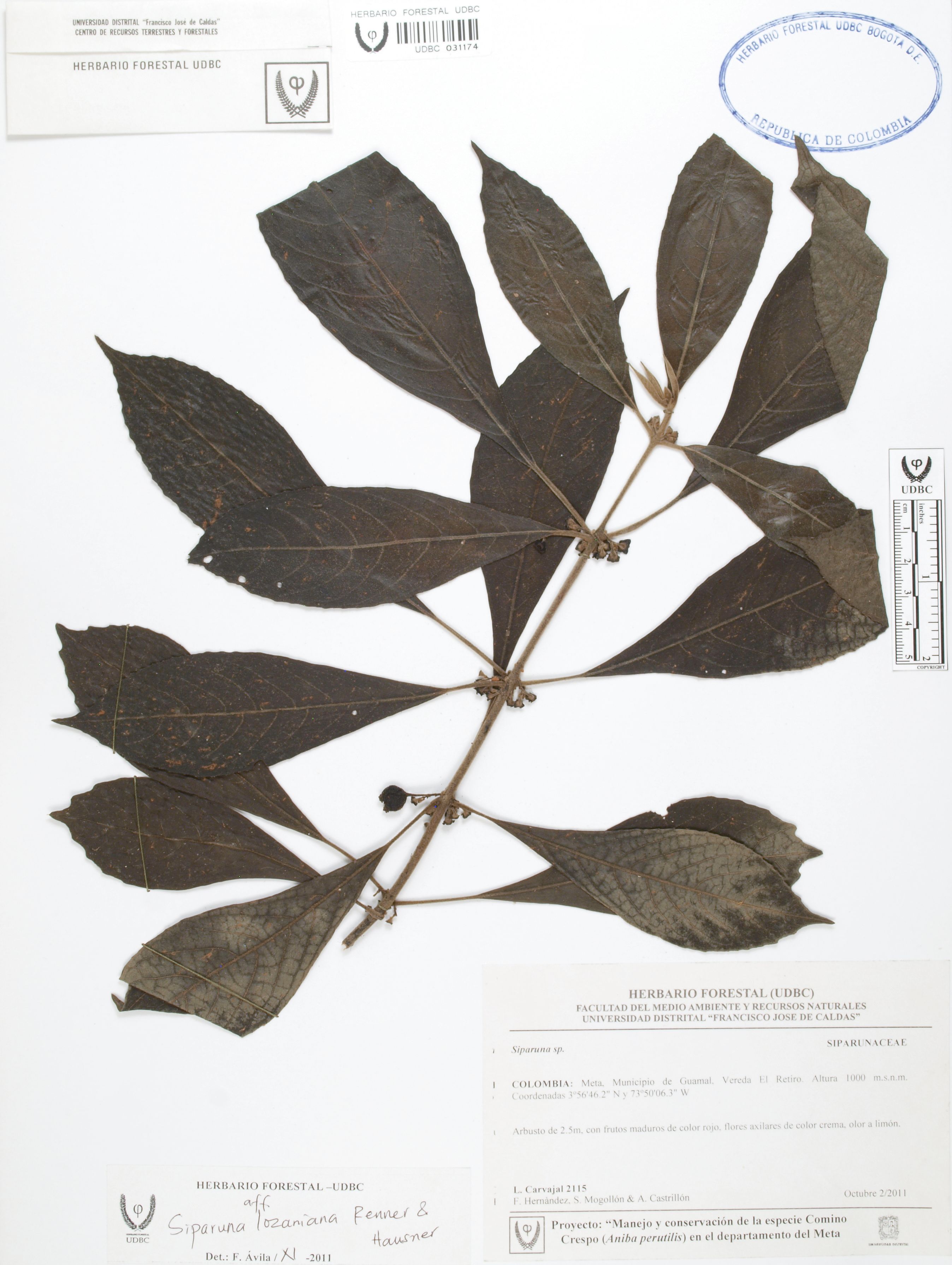 Fotografía del ejemplar Carvajal, L. 2115, determinado como Siparuna lozaniana en el año 2011