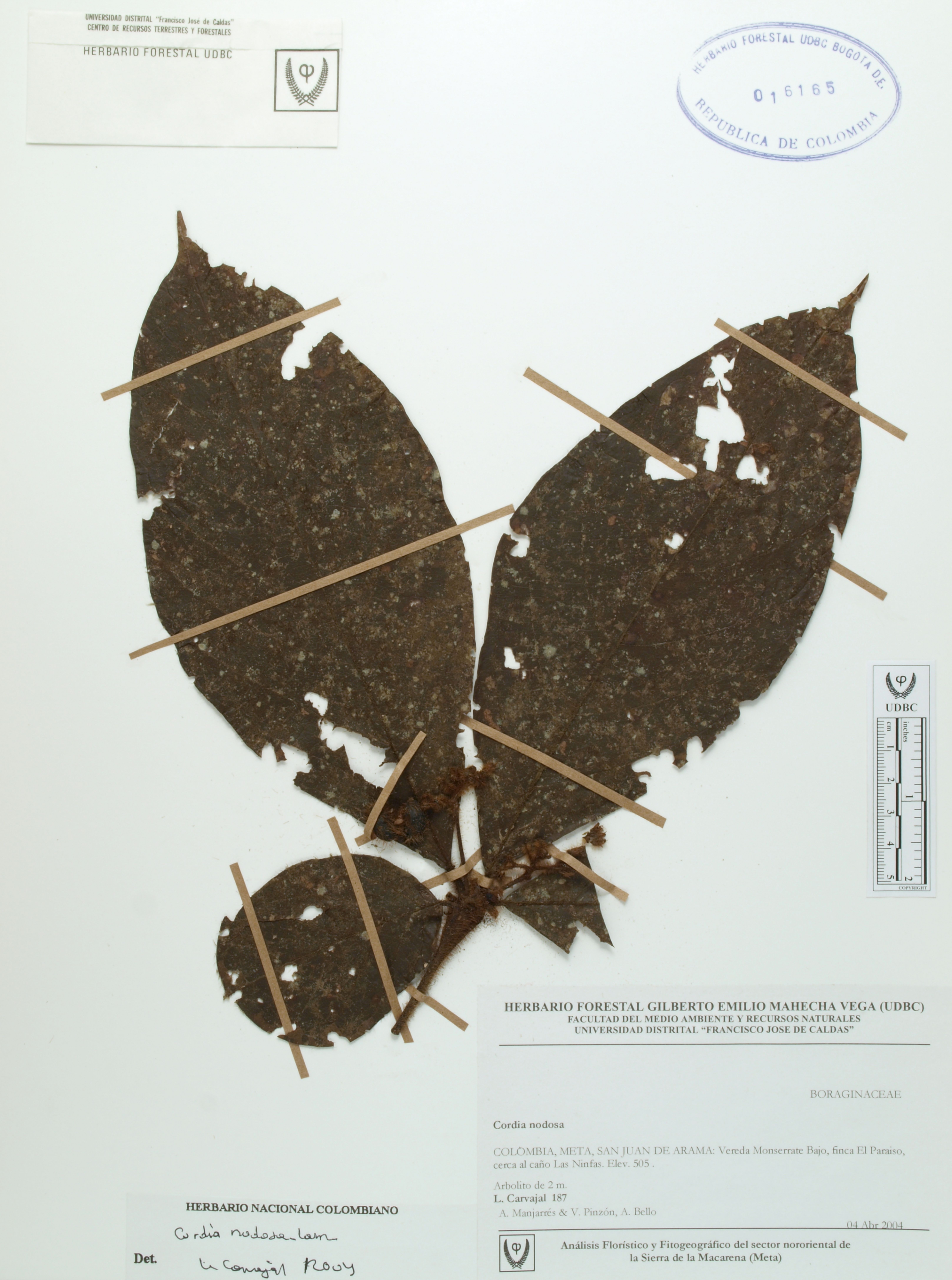 Fotografía del ejemplar Carvajal, L. 187, determinado como Cordia nodosa en el año 2004